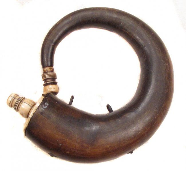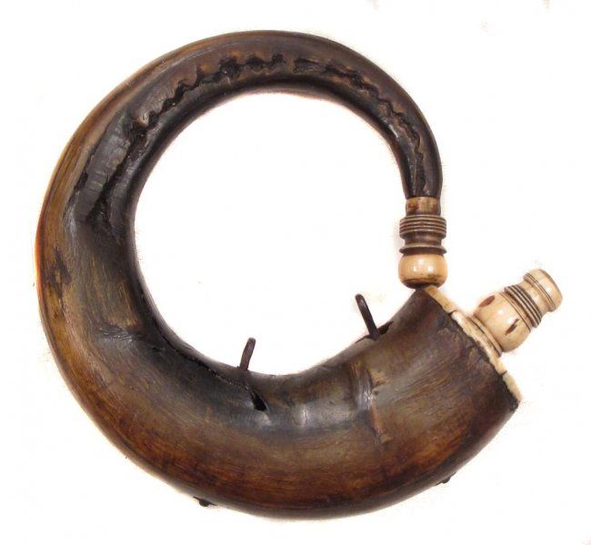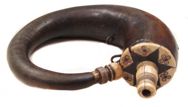 Of horn with turned elephant spout and terminal displaying bird?s eye motifs. 18th century. Some wear. Overall length 18.5 cm.