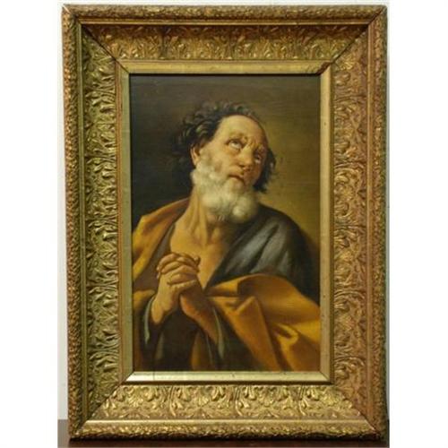 DESCRIPTION: A MUSEUM WORK: THE REPENTANT OF ST. PETER. CARAVAGGIO?S LIGHT AND EMOTION. This painting depicts St Peter, Peter was leader of the Twelve Apostles and one of the closest to Christ. His life divides into three parts: he accompanied Christ during his ministry; after the crucifixion he led the apostles in their teaching of the gospel (the Acts); according to several early accounts, he went to Rome where he established the first Christian community and was crucified by Nero in A.D. 64. His appearance has remained remarkably constant in art and he is the most immediately recognizable of the apostles. The saint is always shown with white hair and beard, and he often wears his yellow cloak over a blue tunic. In this painting St Peter raises his tear-filled eyes to Heaven, his hands joined in prayer. Peter died a martyr's death at a great age. Our artist emphasizes apostle's age in his picture, skilfully revealing his elderly body. Peter's face, worked in thick paint, and his wispy grey hair are placed most fully in the light and stand out boldly from the almost dark, diffuse background. A golden background emphasizes this moment of repentant of the Saint and gives strong emotion to the viewer.