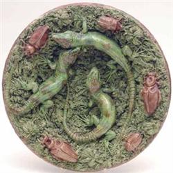 A Mafra Palissy style circular wall plaque with 3 lizards and 5 beetles, 12ins. £300-400...