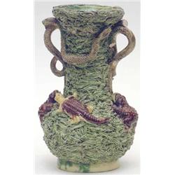 A Mafra Palissy vase with serpent handles and applied with lizards and toads, 7ins. (a.f.) £100-1...