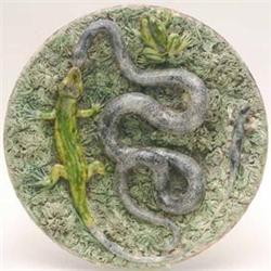 A Mafra Palissy wall plaque, applied with a fighting snake and lizard, a smaller lizard and a frog 12ins. £250-300