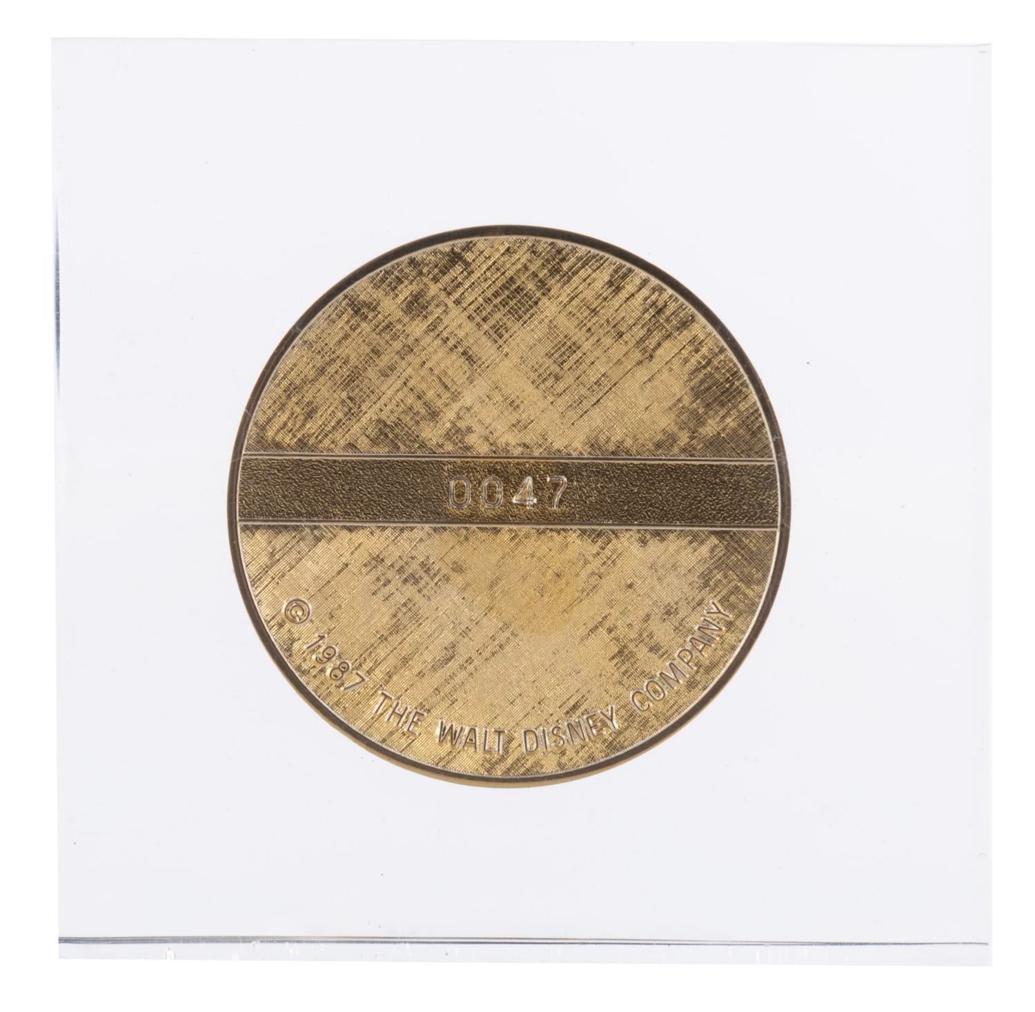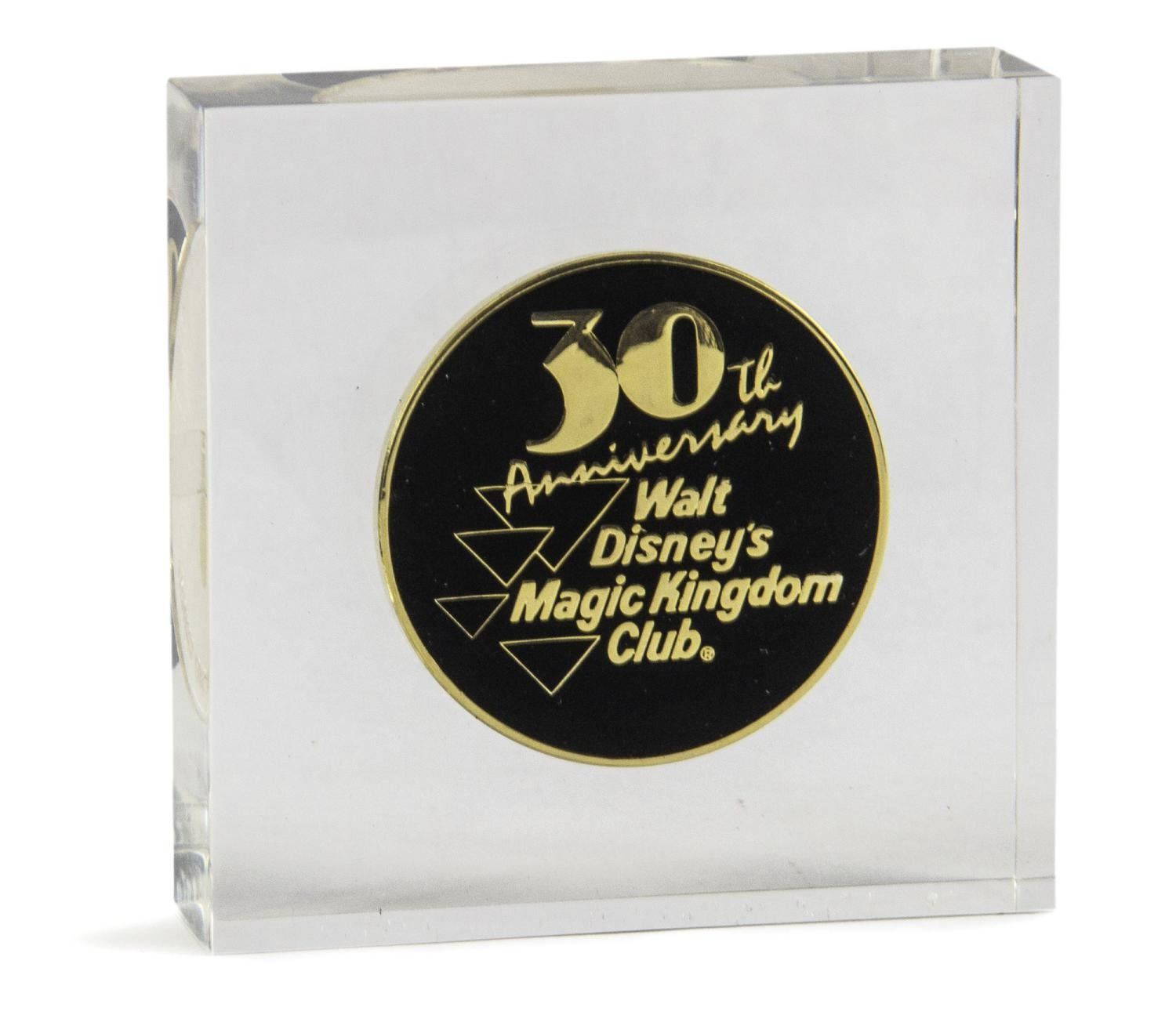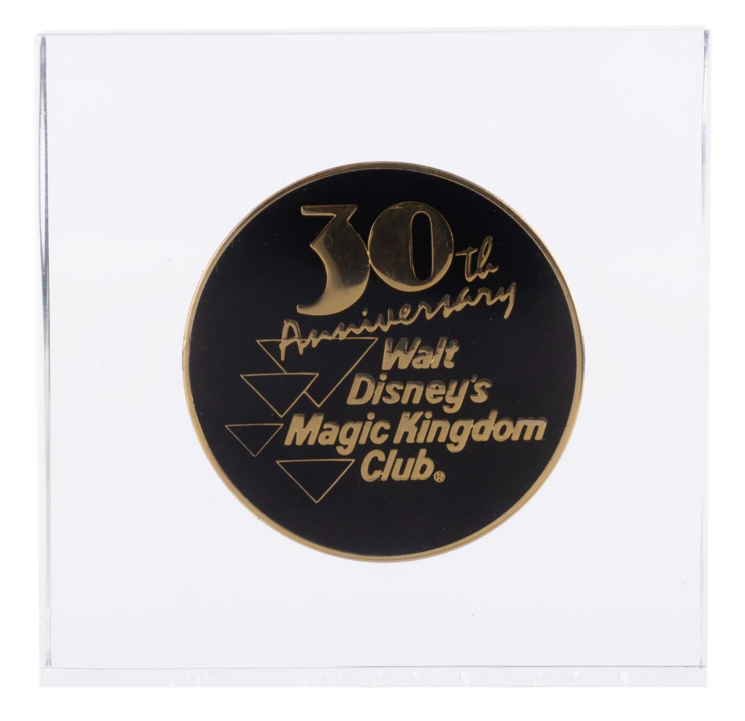 (Disneyland, 1987) A rare commemorative coin created for the 30th anniversary of Disneyland's Magic Kingdom Club. This coin is numbered 0047 on the back and is encased in lucite for display. Measuring 1.75” in diameter in 3” x 1” x 3.25” lucite, the coin is in very good condition with light wear and scratches.