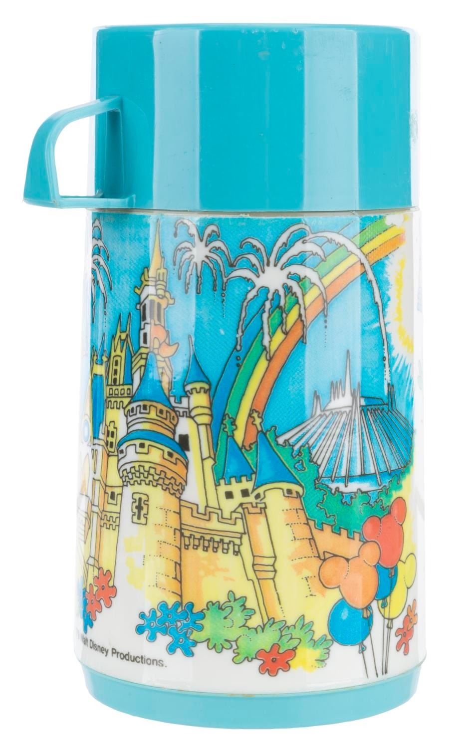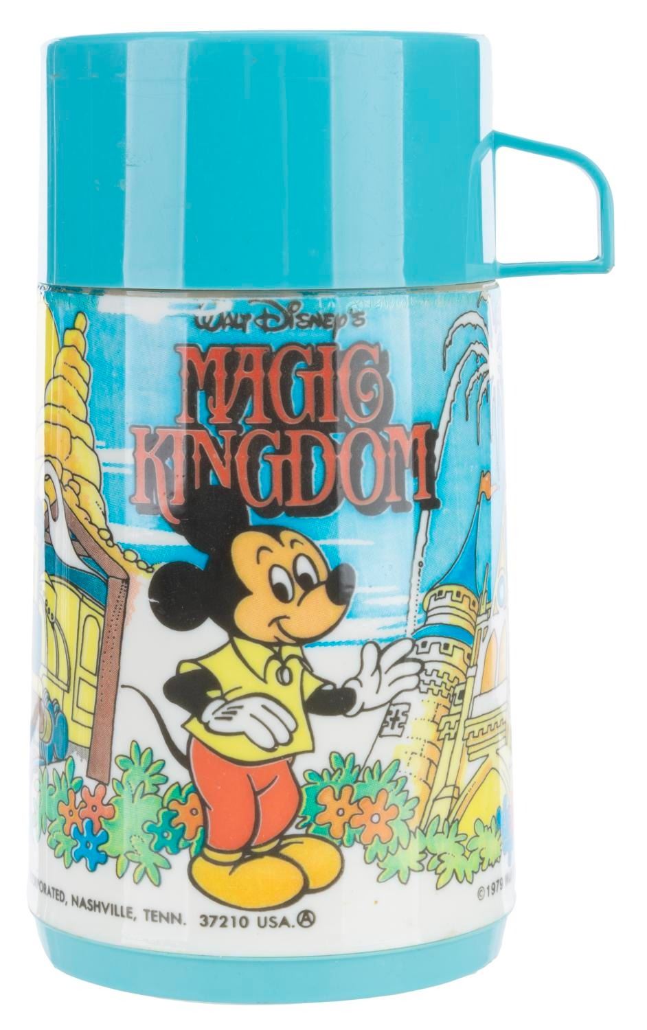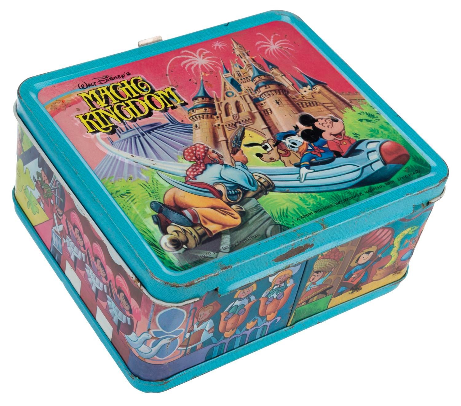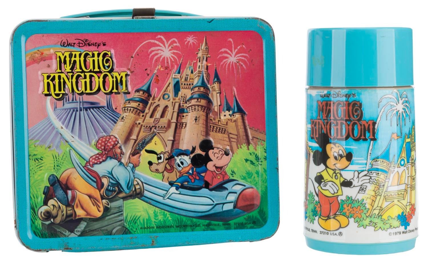 (Aladdin, 1979) A Walt Disney’s Magic Kingdom lunch box and thermos, featuring images of Disney characters visiting Space Mountain, the Haunted Mansion, and other attractions. The lunch box is in fair condition with wear and spots of oxidation throughout. The thermos displays in good condition, missing the inner lid but retaining the cup top.