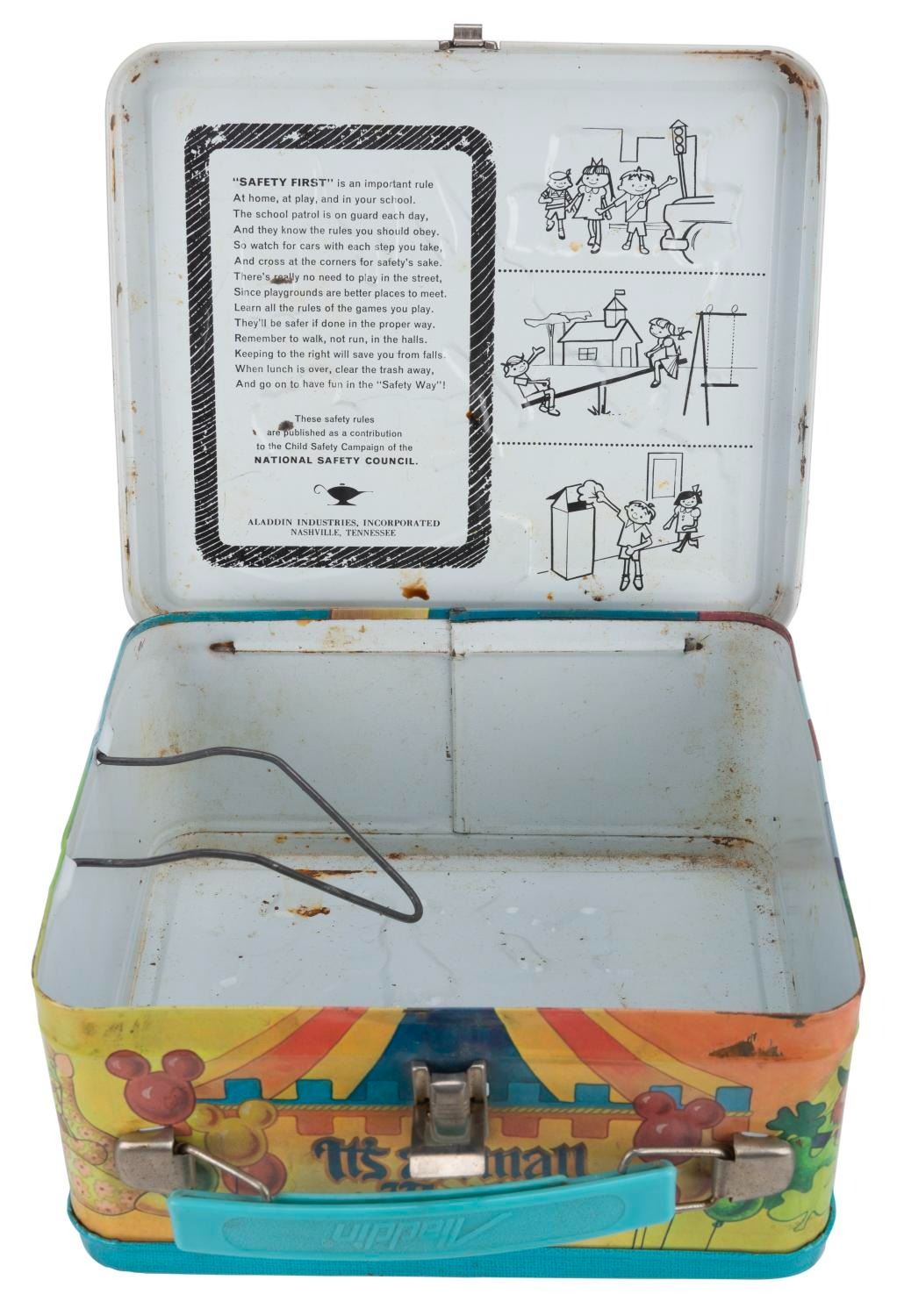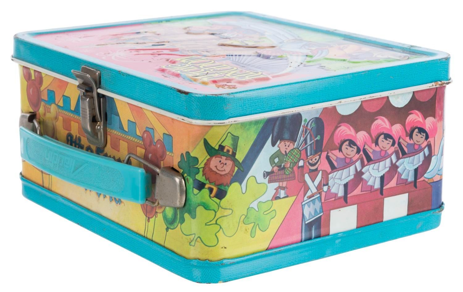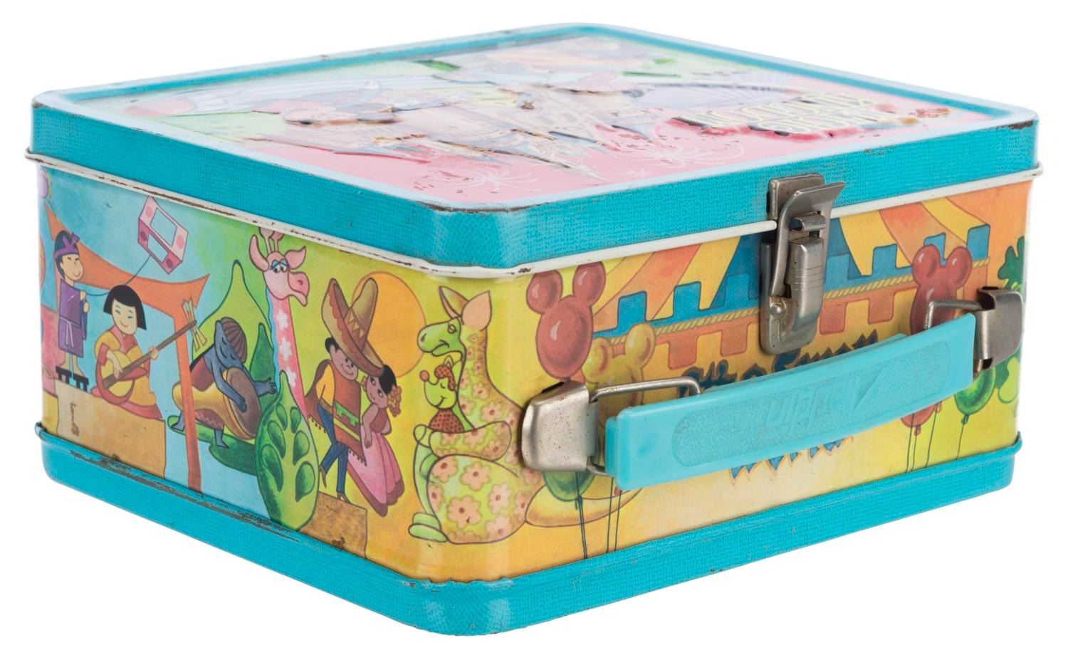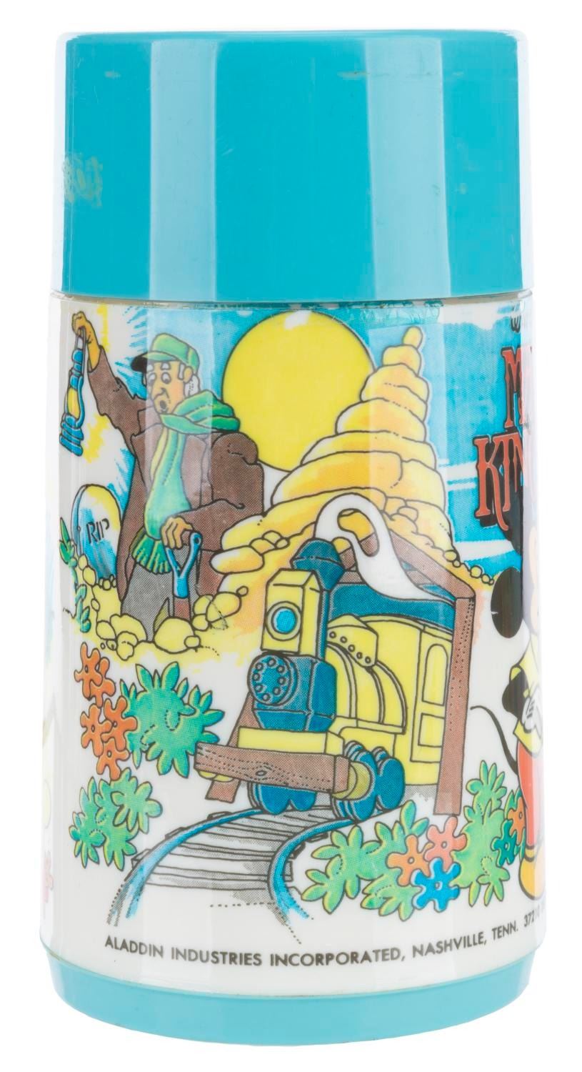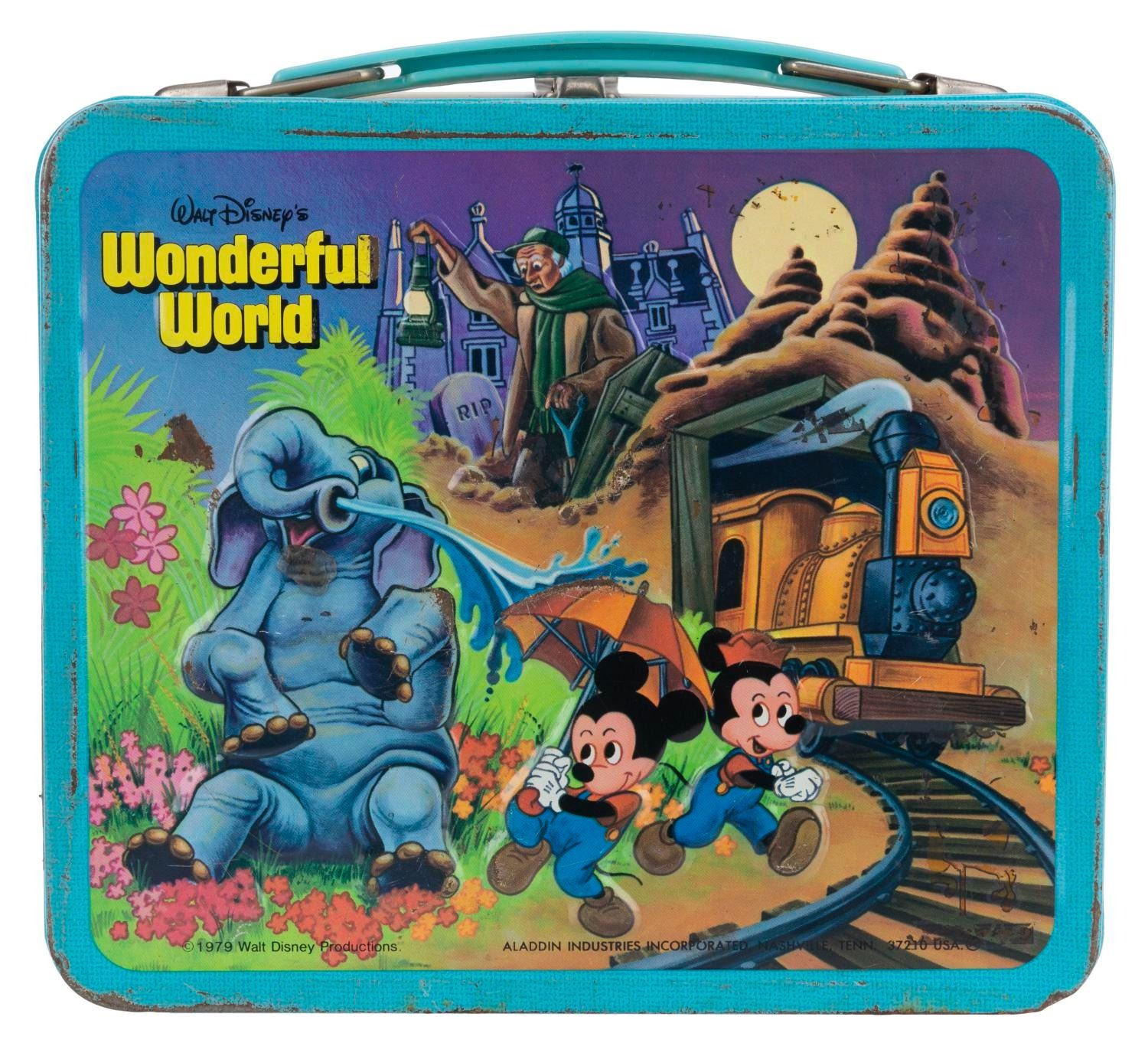(Aladdin, 1979) A Walt Disney’s Magic Kingdom lunch box and thermos, featuring images of Disney characters visiting Space Mountain, the Haunted Mansion, and other attractions. The lunch box is in fair condition with wear and spots of oxidation throughout. The thermos displays in good condition, missing the inner lid but retaining the cup top.