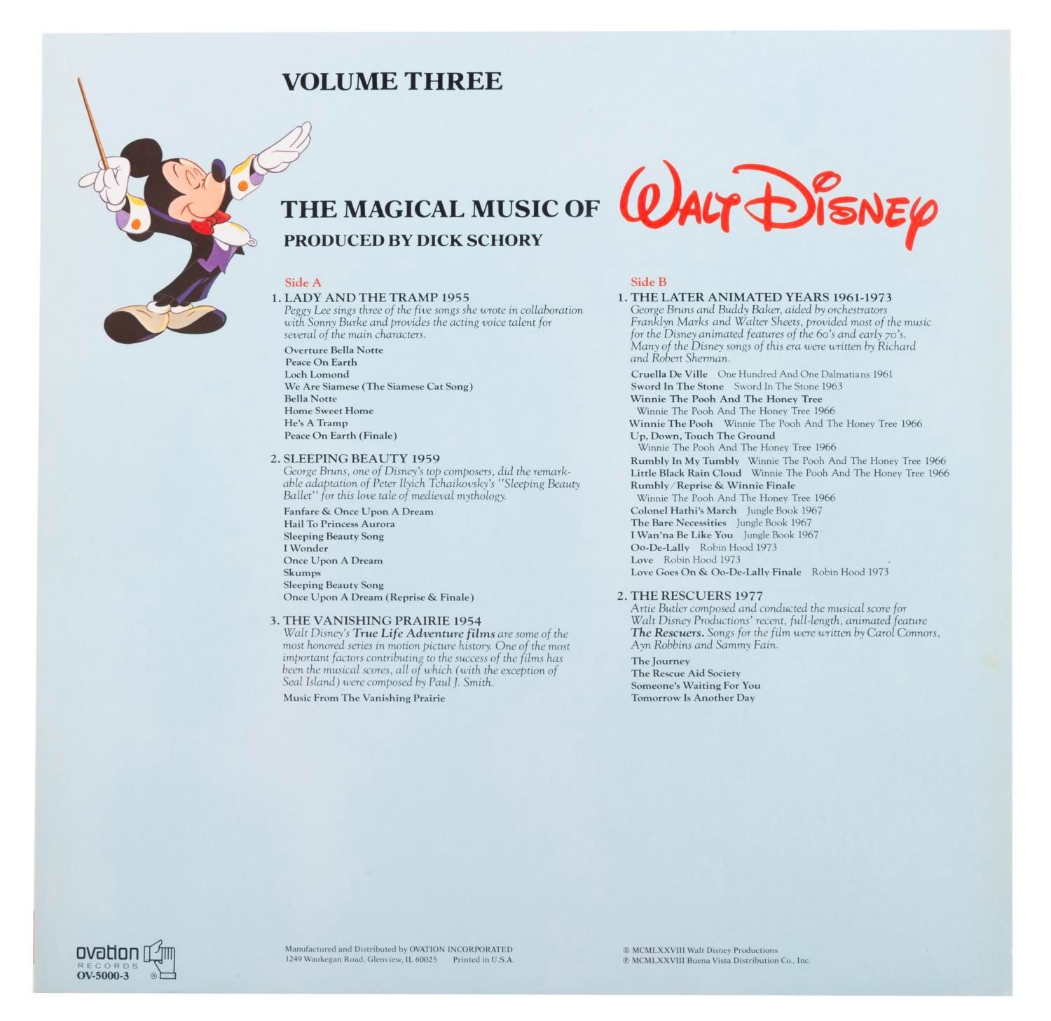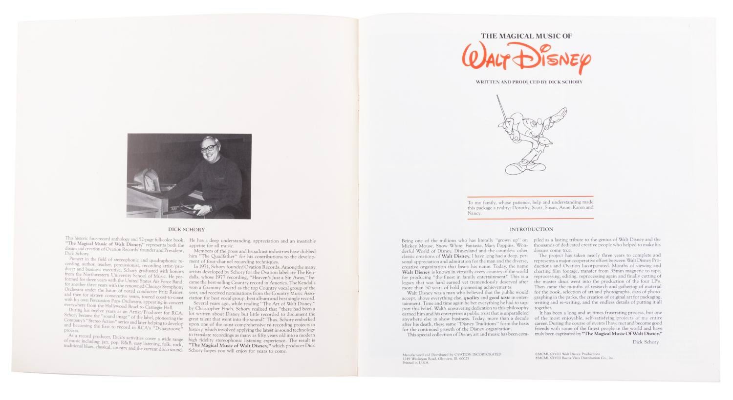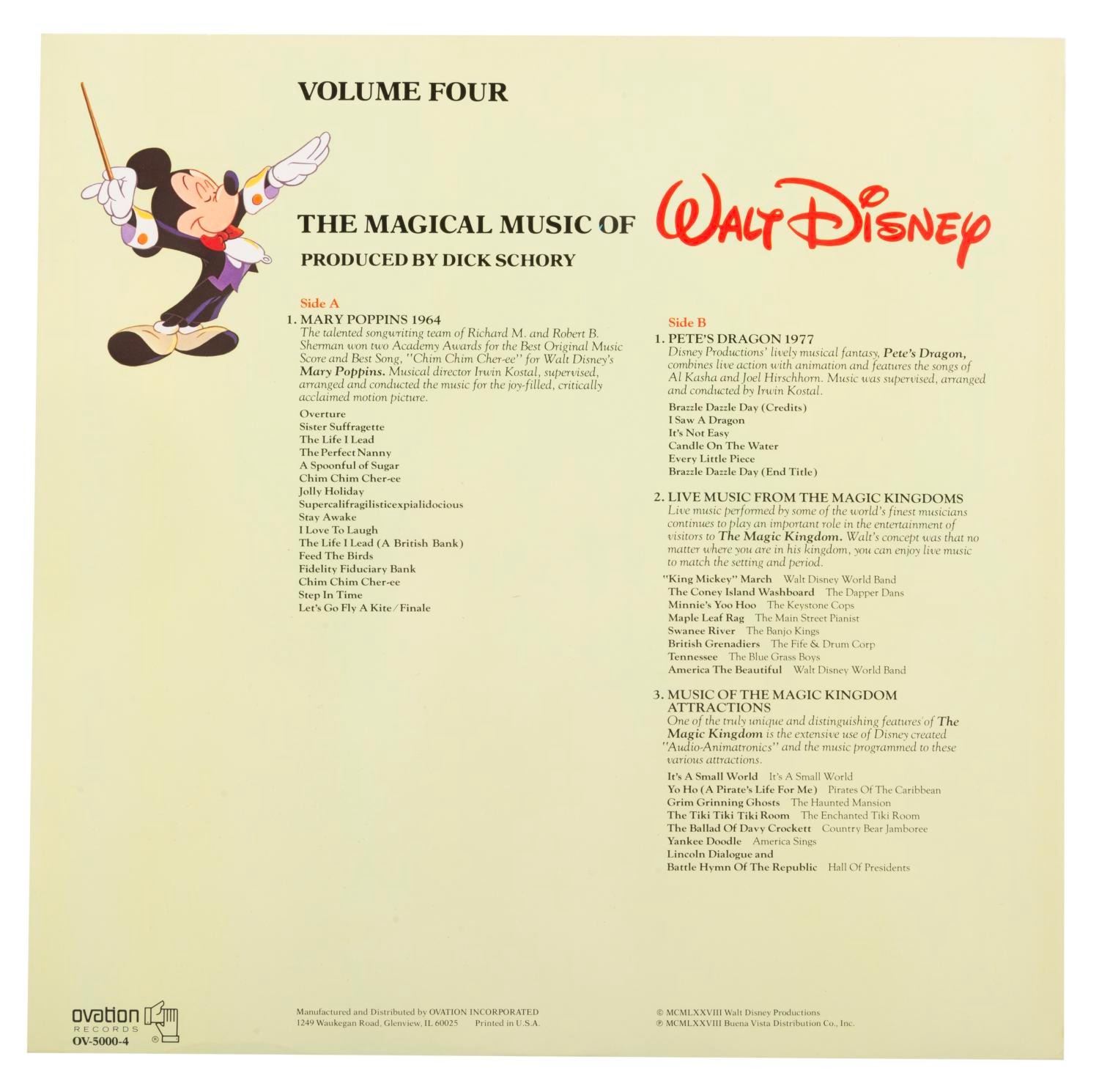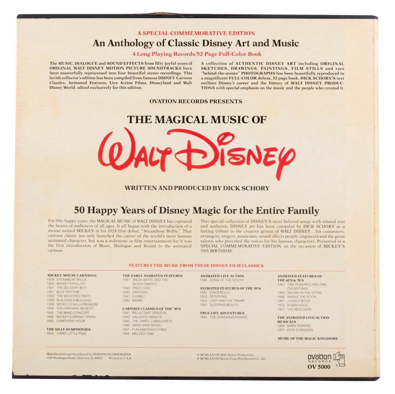 (Ovation Records, 1978) A The Magical Music of Walt Disney: 50 Years of Original Motion Picture Soundtracks 4-LP record set, featuring a 48-page softcover book insert. Measuring 12.5” x 12.5”, the set is in good to very good condition with light creases, discoloration from age, scratches, and handling wear, while the slipcover is in fair condition with heavy discoloration, creases, and wear.