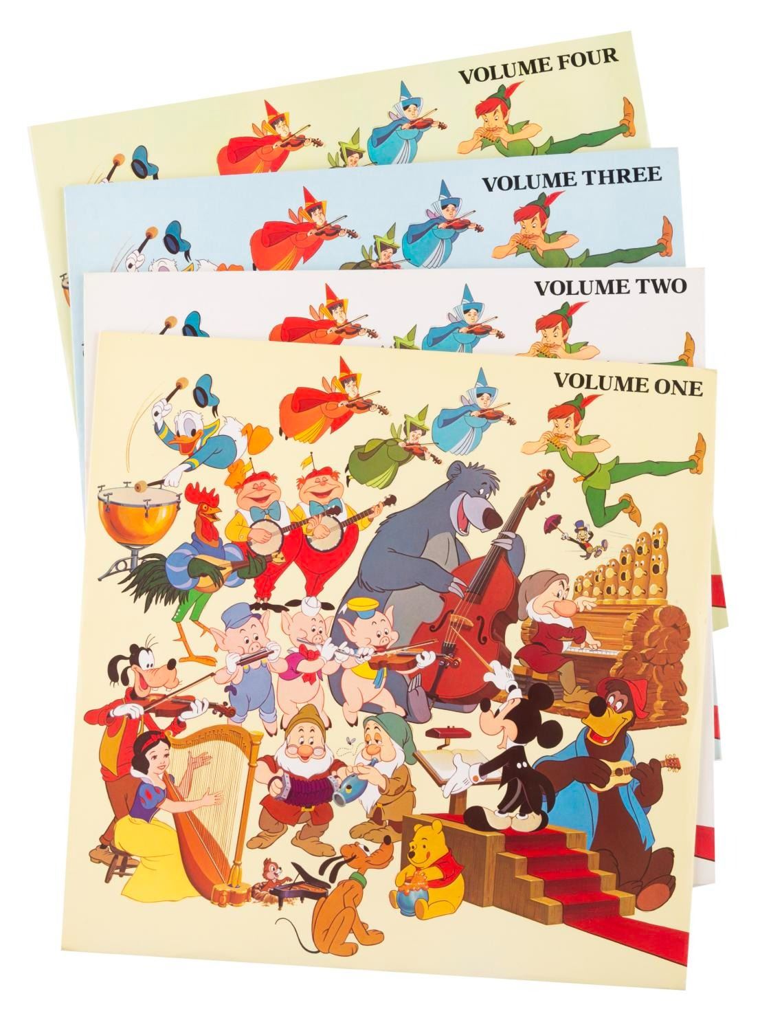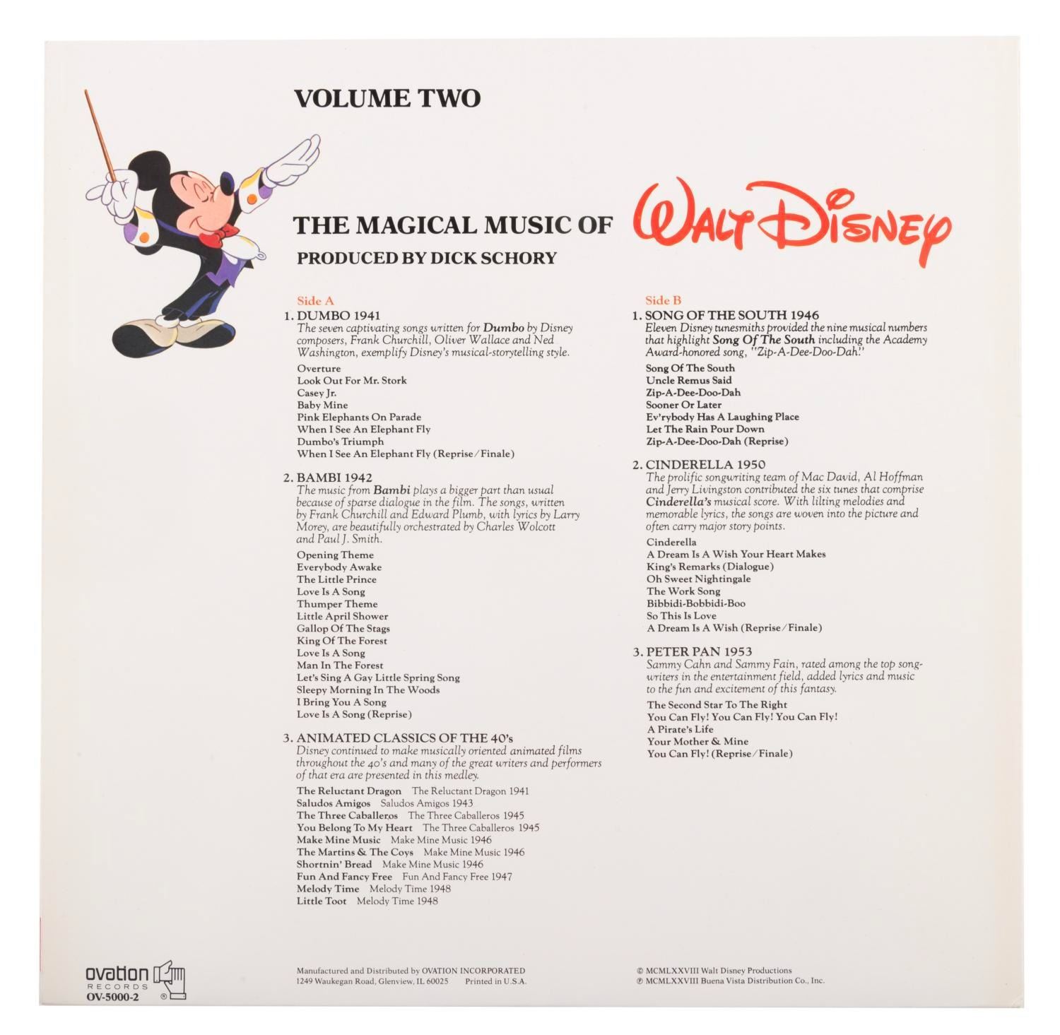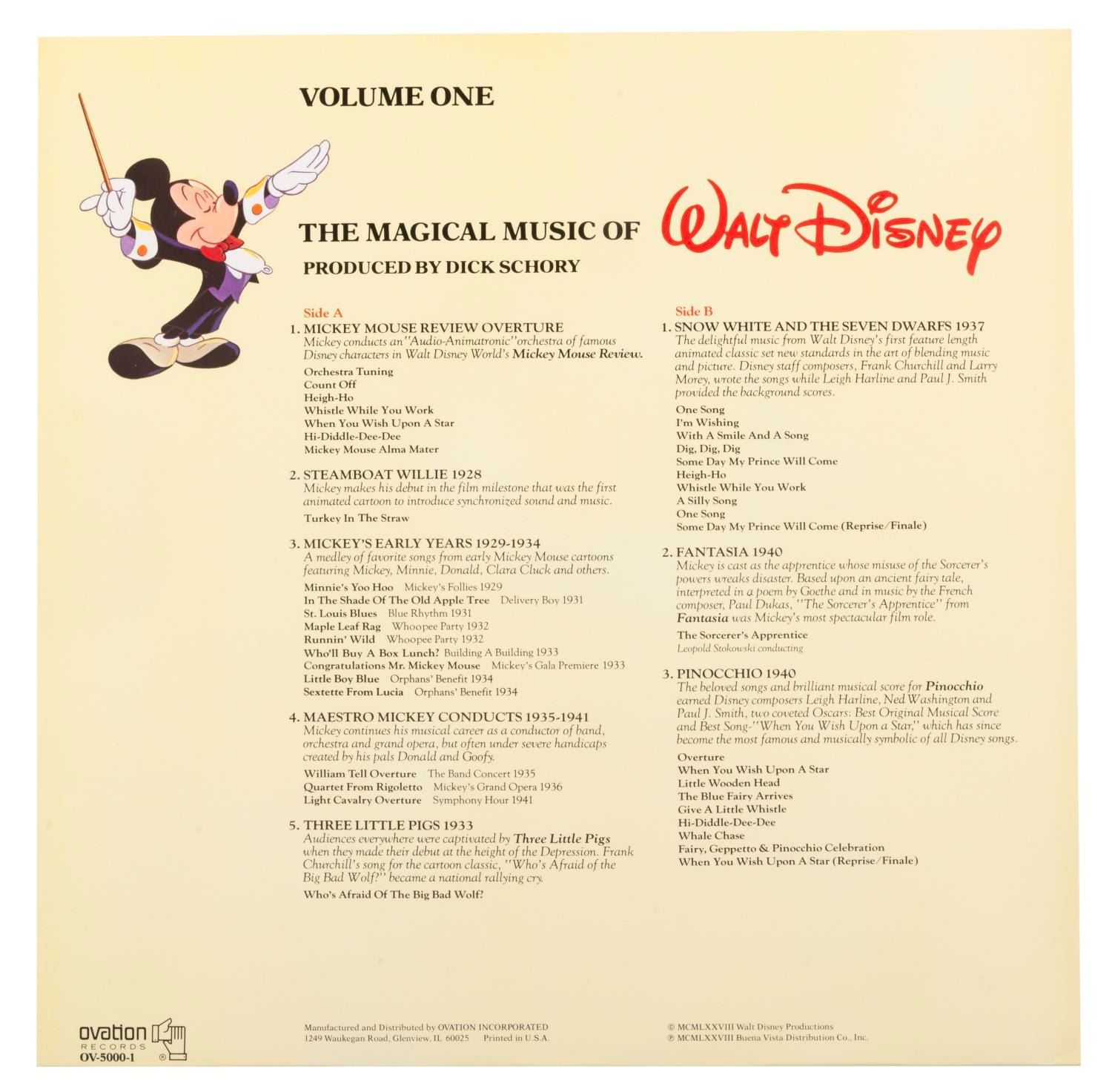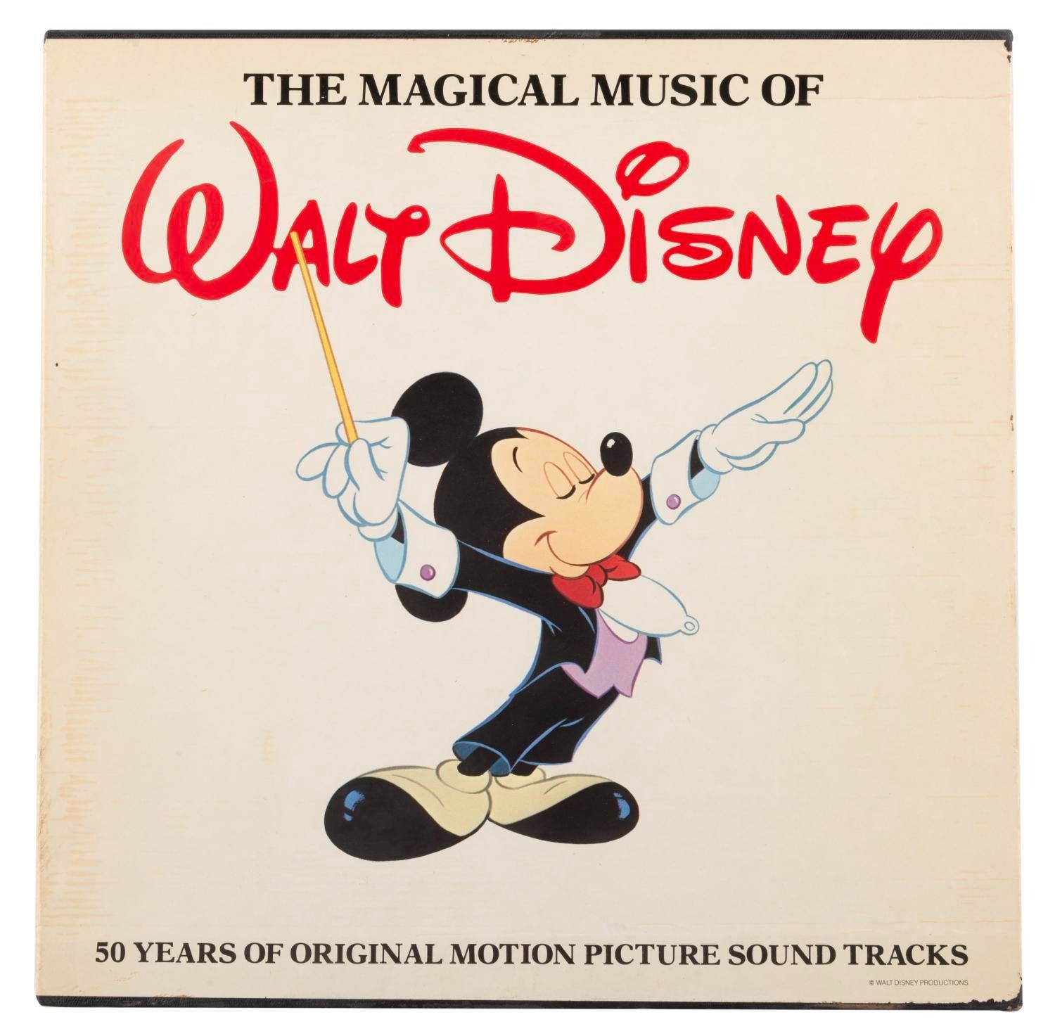 (Ovation Records, 1978) A The Magical Music of Walt Disney: 50 Years of Original Motion Picture Soundtracks 4-LP record set, featuring a 48-page softcover book insert. Measuring 12.5” x 12.5”, the set is in good to very good condition with light creases, discoloration from age, scratches, and handling wear, while the slipcover is in fair condition with heavy discoloration, creases, and wear.
