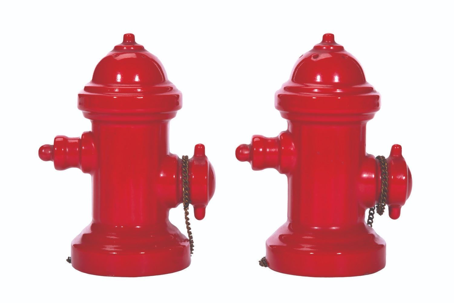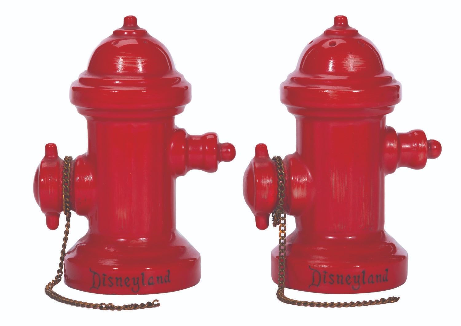 (Disneyland, 1950s) A pair of souvenir fire hydrant salt and pepper shakers with chain accents. Measuring 4.25” tall and 3.25” wide, the ceramic pieces are in very good condition with very light wear.