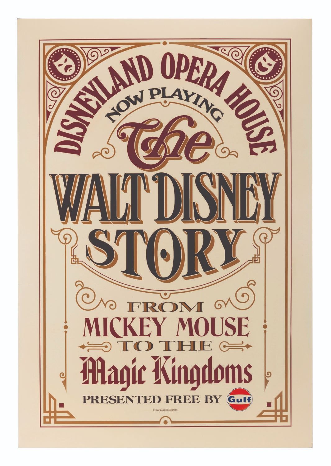 (Disneyland, 1973-75) A hand-painted sign promoting the Disneyland Opera House presentation of "From Mickey Mouse to the Magic Kingdoms" and "The Walt Disney Story," presented by Gulf Oil. Measuring 45.25" x 30.75", the artifact of this very early tribute to the life and works of Walt Disney has been mounted to wood for preservation and expertly restored to very good to fine condition.