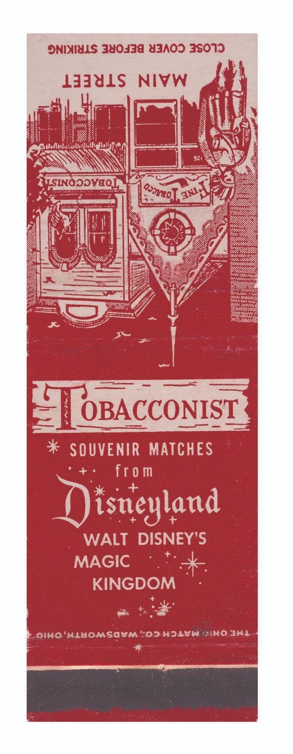(Disneyland, 1950s-1970s) A Tobacconist Souvenir Matches from Disneyland Walt Disney’s Magic Kingdom sleeve from the Fine Tobacco shop once located on Main Street, U.S.A. Measuring 1.5” x 4.5”, the matchbook is in very good condition with light edge wear, intended creases, and light water damage on the reverse.