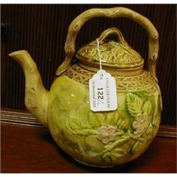 A Majolica Tea Pot and cover, decorated blossom, with a crabstock handle, 22 cm £30 - 50