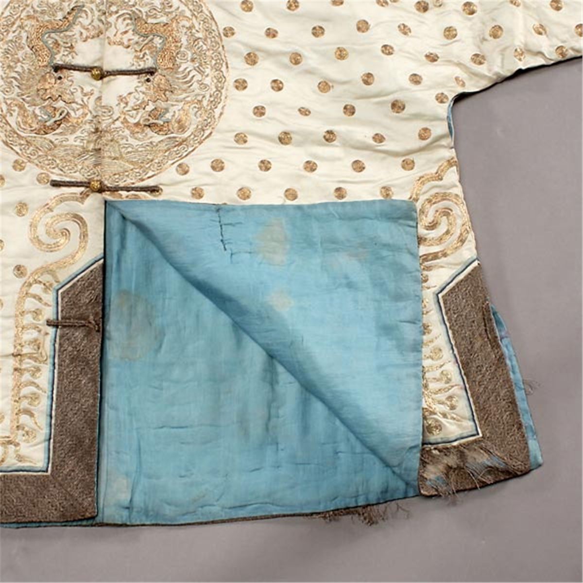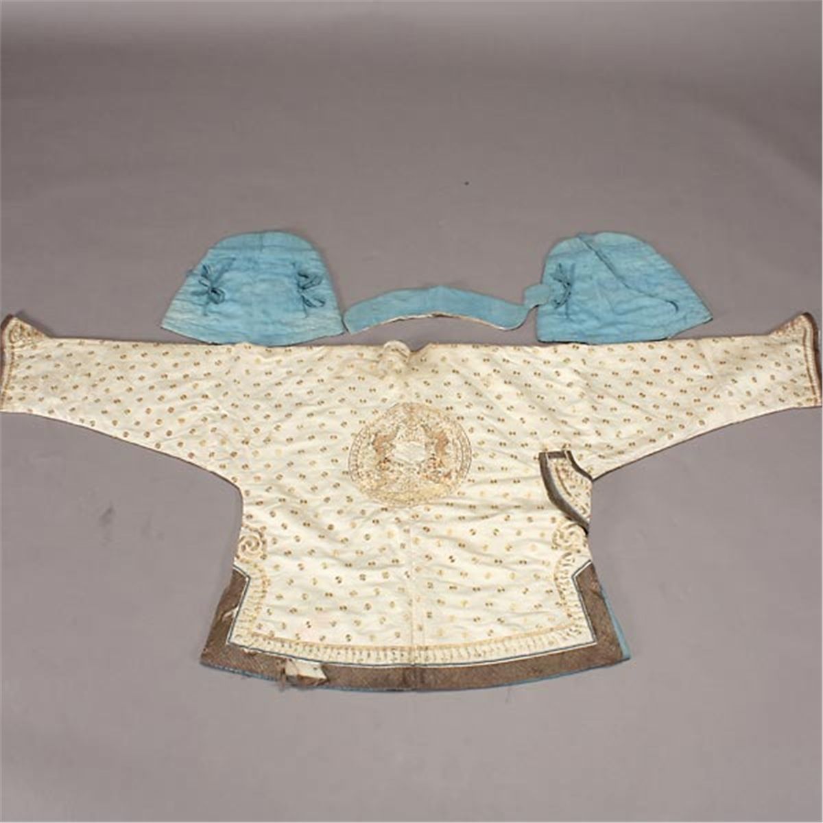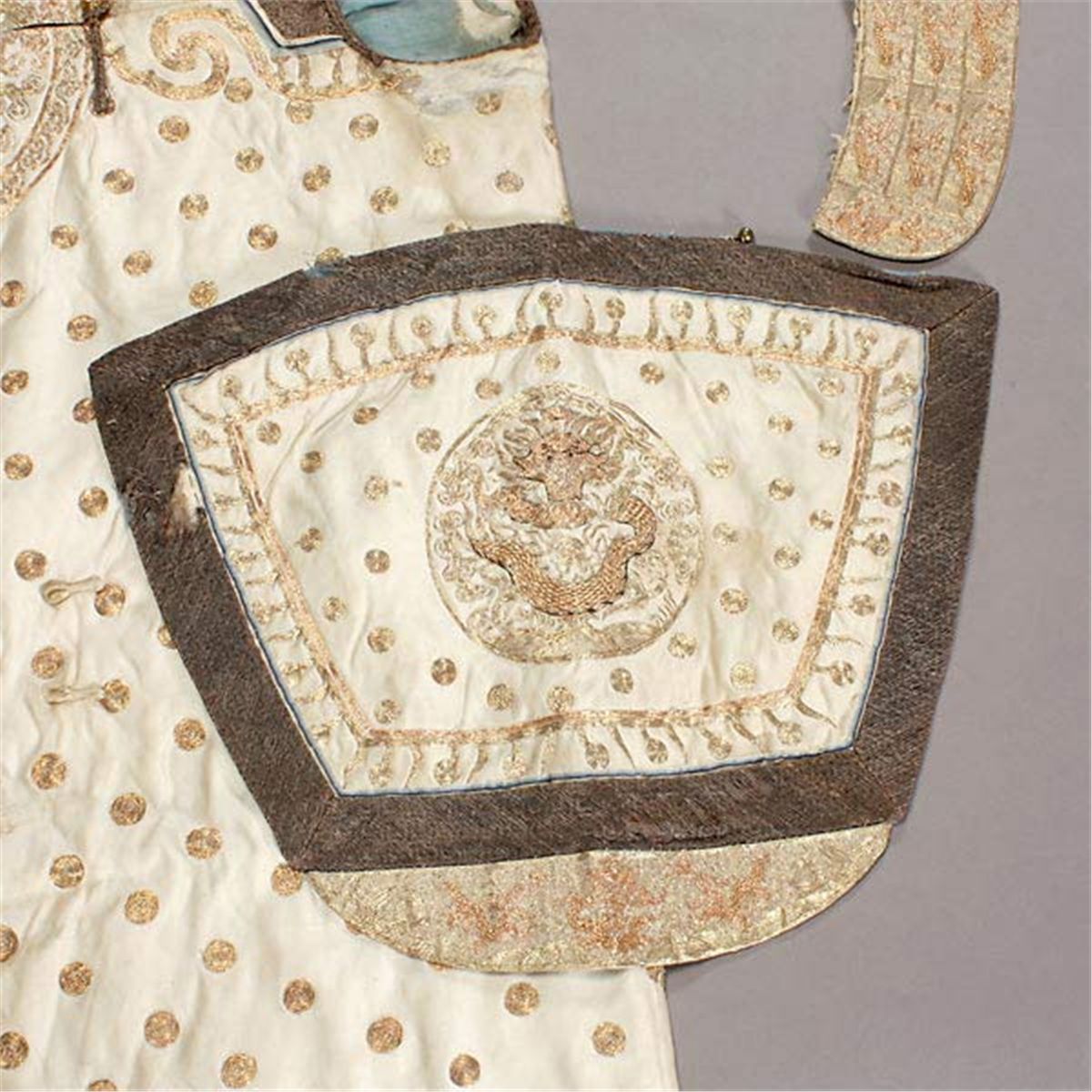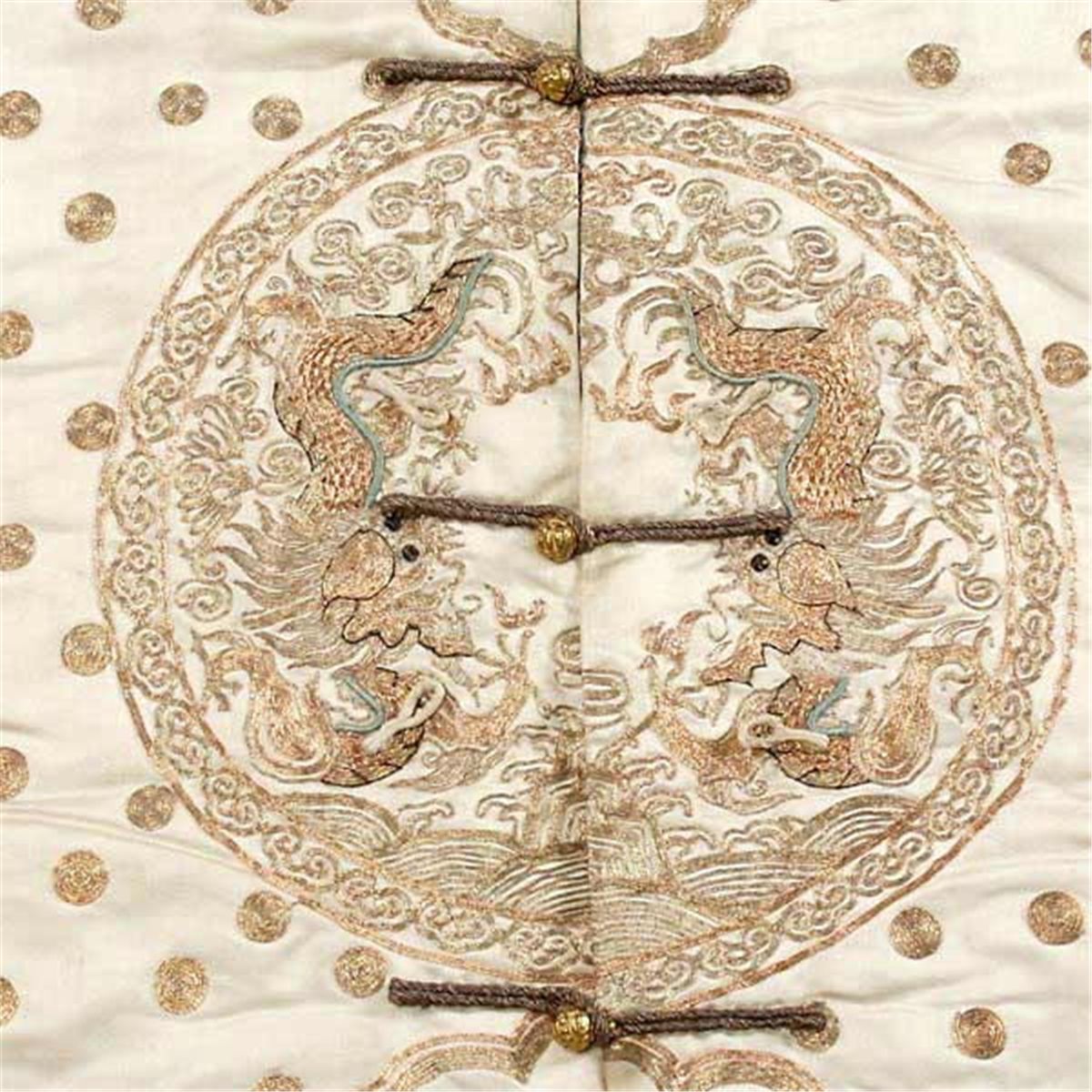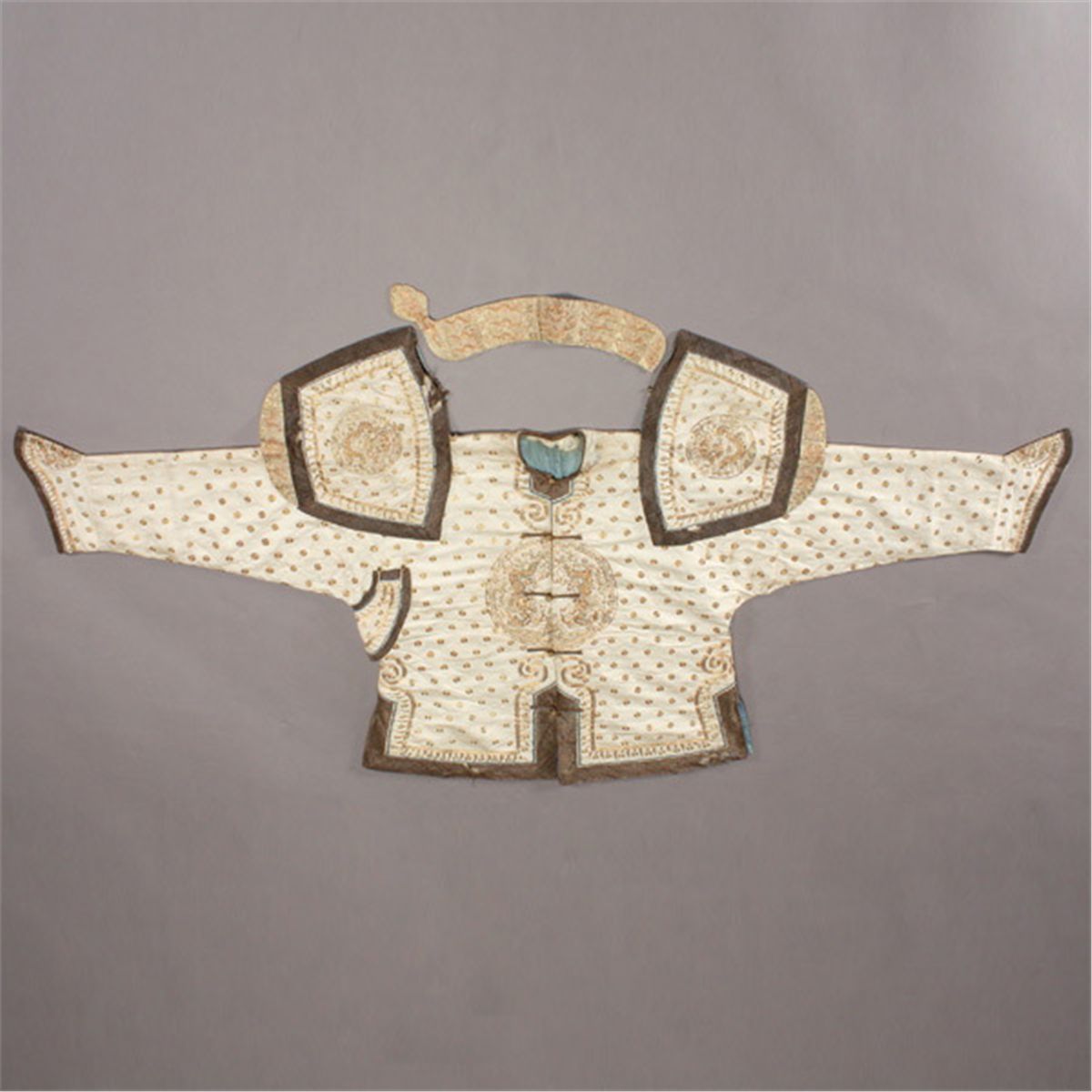 A Manchu Military Officer's White Satin Ceremonial Armored Jacket, Of waist length, the padded garment with a center front opening fastened with five gilt metal buttons, decorated to either the front and back with a roundel containing a pair of facing dragons amid clouds, surrounded with gilt embroidered whorls; together with three epaulettes. Circa 1900, Length: 31 1/2 inches (80 cm) Provenance:Acquired from Christie's London, November 9, 2007, Lot 375. [Wear, some losses and tears to fabric mostly notable to lining and bands applied at edge. Stained and worn lining. Missing one underarm epaulette. This condition report states major condition issues only.]
