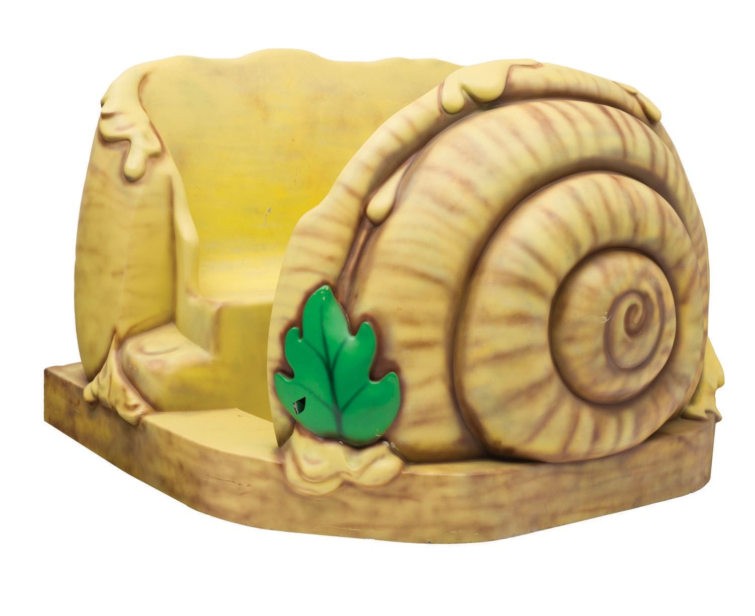 (Disneyland, 1999) The front seat of a ride vehicle from the Many Adventures of Winnie the Pooh attraction at Disneyland. Guests rode through the attraction in this seat, with the canopy of the back seat forming the larger end of the beehive. Measuring 55"x51"x39" high, the seat is in good condition, with wear throughout from Park use, including scuffs especially to the floor, and small scratches and cracks to the tip of the front, and the green leaf feature.