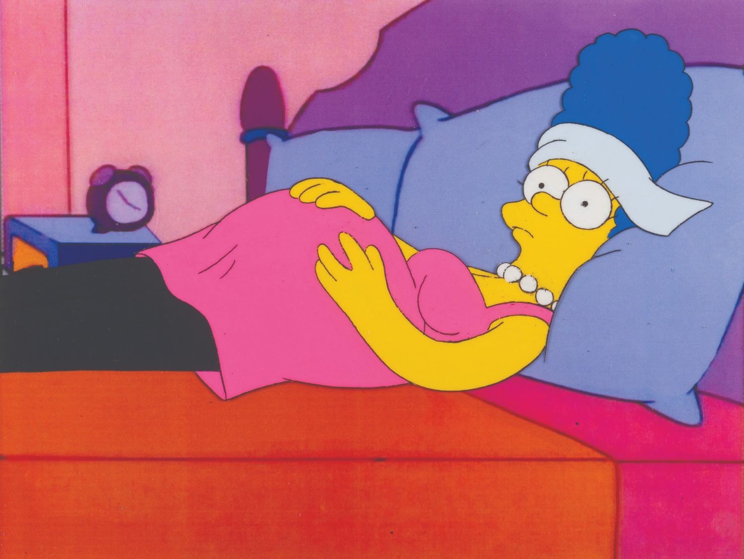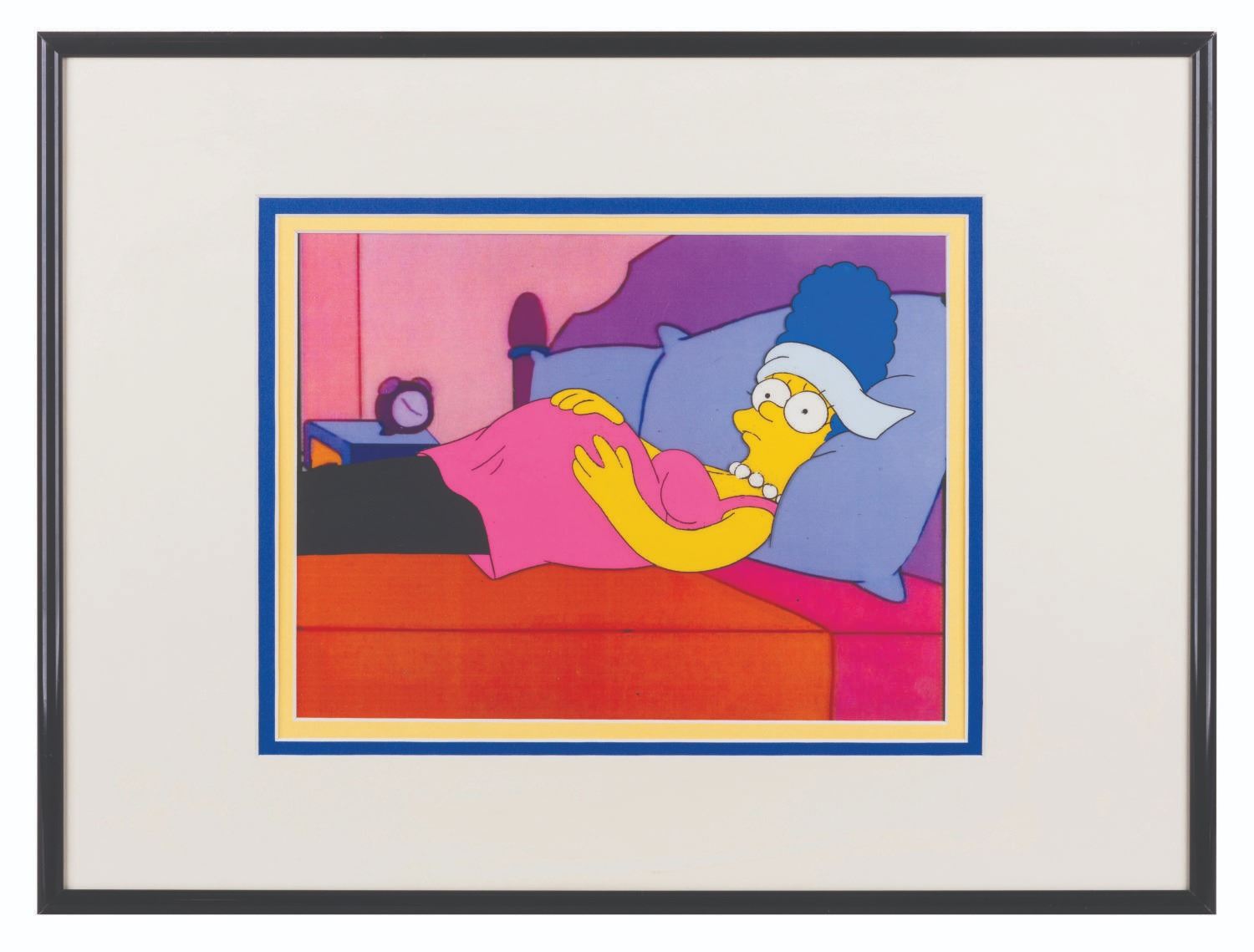 (Fox, 1992) An original production cel of Marge from “The Simpsons” season 4 episode “Lisa’s First Word” with a scene-matching color copy background. With a character image size of 4.5” x 8.5” on a 6.75” x 9” in a 12.25” x 16.25” matted frame, the cel displays in very good condition with light line loss and ink residue
