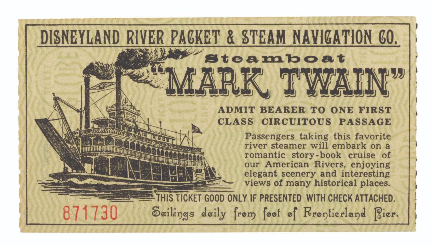 (Disneyland, 1950s) An admission ticket for the Steamboat Mark Twain in Frontierland at Disneyland. Measuring 4.75"x2.5", the ticket numbered "871730" is in very good condition exhibiting light soiling and wear from handling and age.