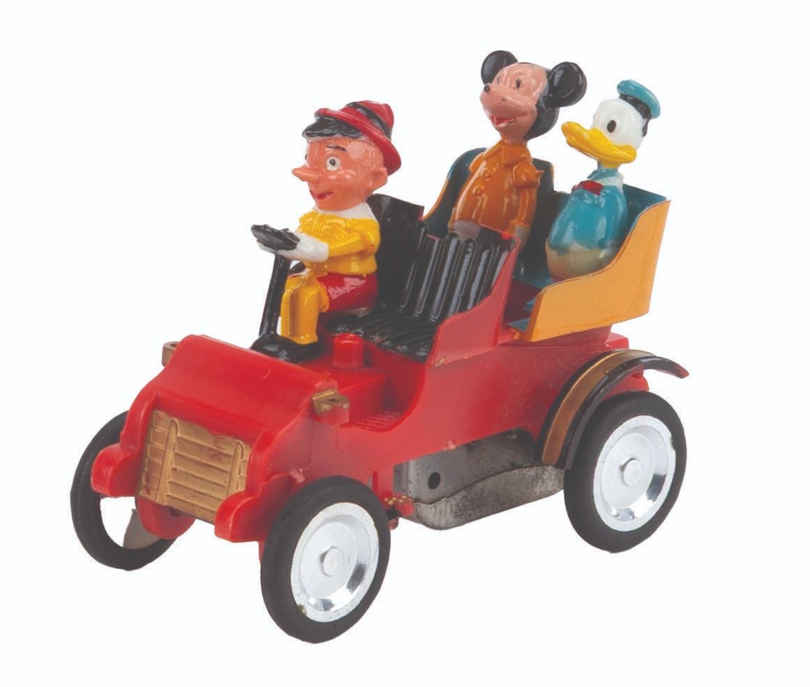 (Marx, 1968) A complete 6 Old-Fashioned Cars with Walt Disney Characters as Drivers set by Marx. Included are cars with Donald, Mickey, Pluto, Goofy, and Pinocchio, and two of Donald’s nephews driving a train. The cars range in size from 2.75” x 3.5” x 2” tall to 4.5” x 2” x 3.5” with their original 14” x 2.25” x 6.75” box. The set is in good to very good condition with spots of paint loss and chipping, wear, and one wheel missing its rubber. The box is in fair condition with tears up to 3.75” long, tape residue, stains, wear, and pencil inscriptions.