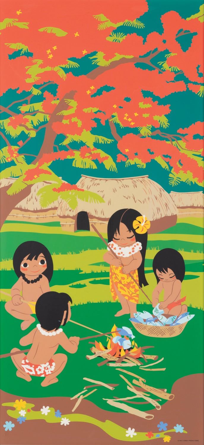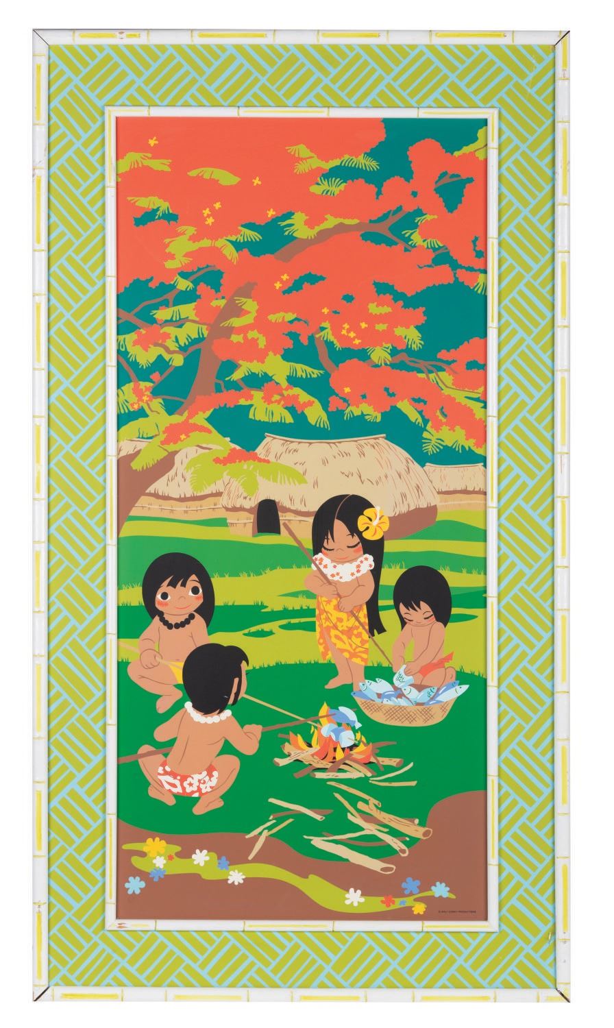 (Polynesian Resort, 1970s) An oversized silkscreened print from Disney's Polynesian Village Resort Guest Suites. The piece is inspired by Mary's concept art and depicts three Polynesian "Children of the World." The piece is still in its original bamboo motif frame measuring 25.25"x45.25", and is in good condition with scuffs, scratches, and wear throughout from Resort display, handling, and age.