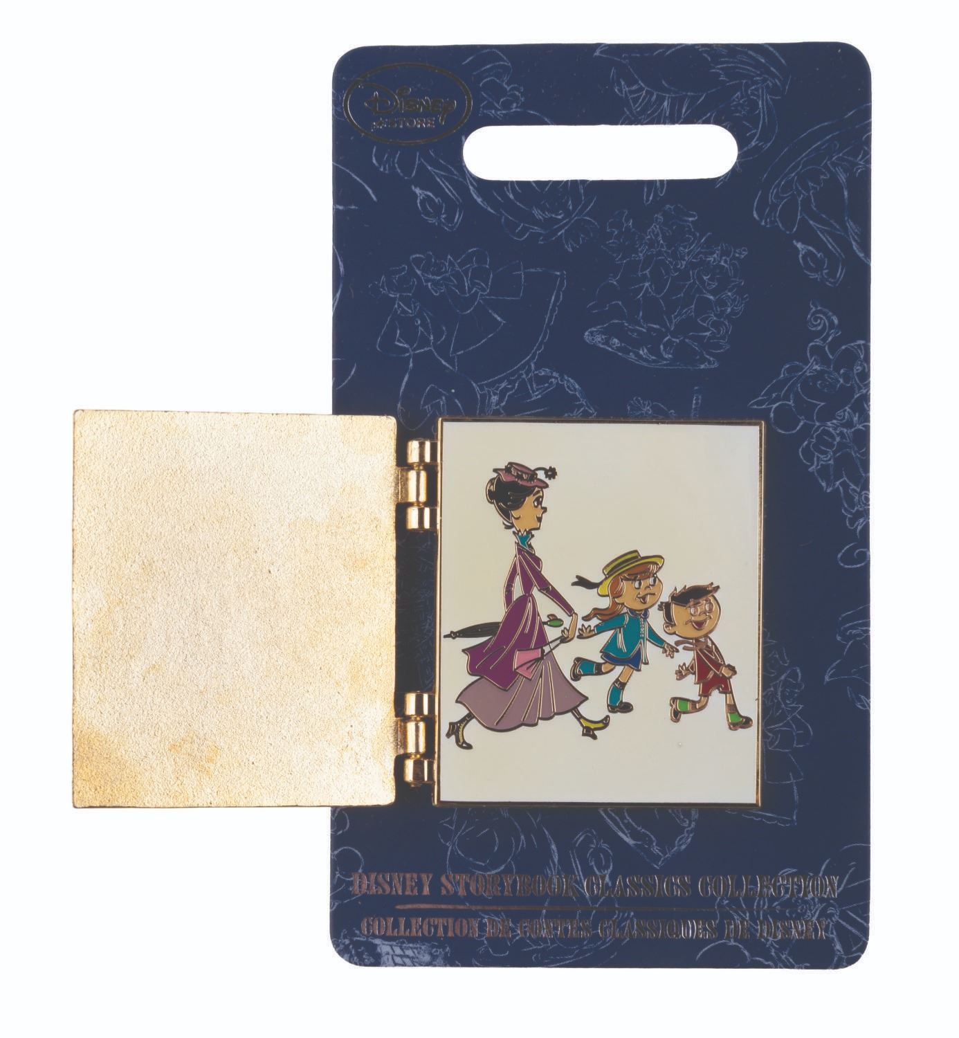 (Disney, 2017) A “Mary Poppins” hinged book pin, released in the Disney Storybook Pin Collection in January 2017. Measuring 1.5” x 1.75” the LE 1100 pin is in fine condition on the original card.