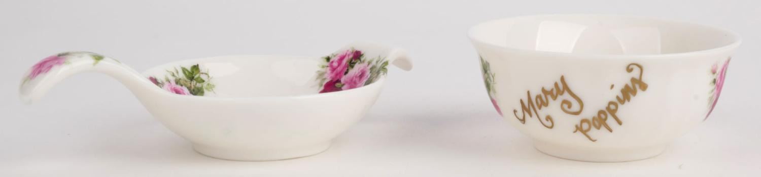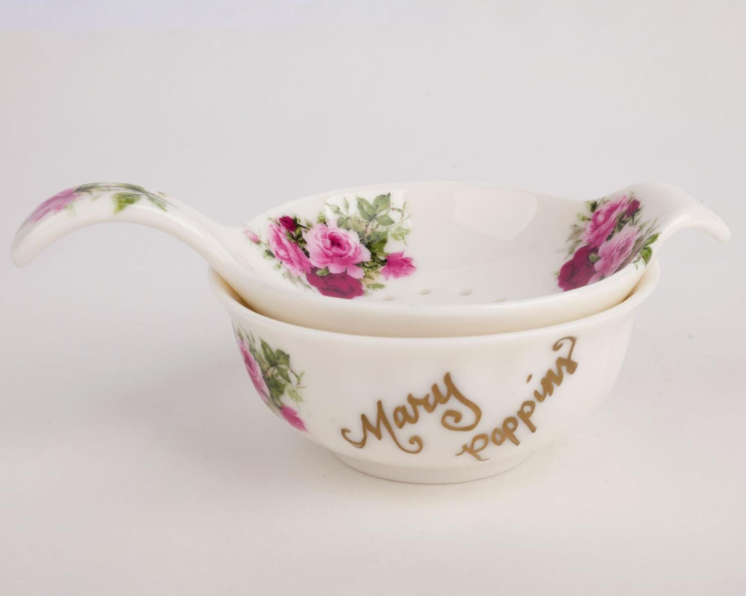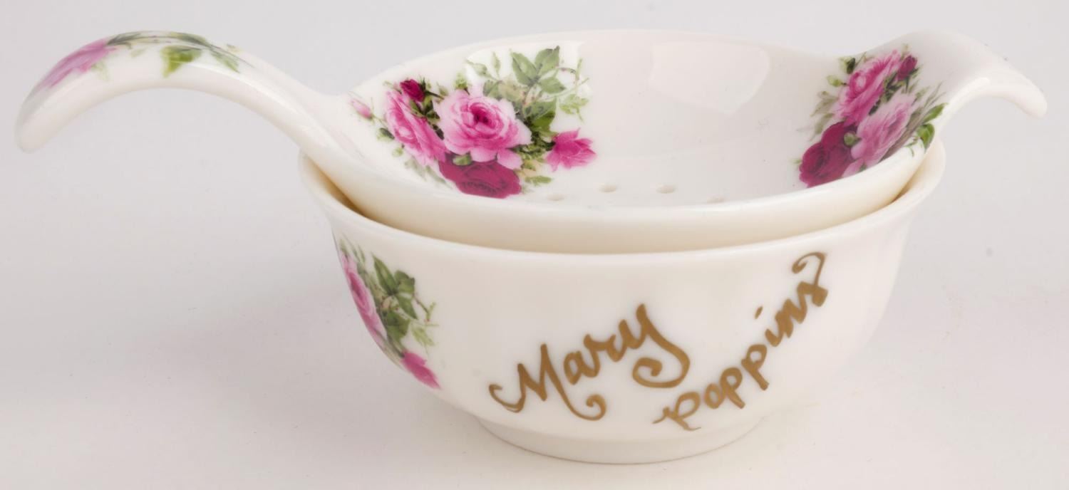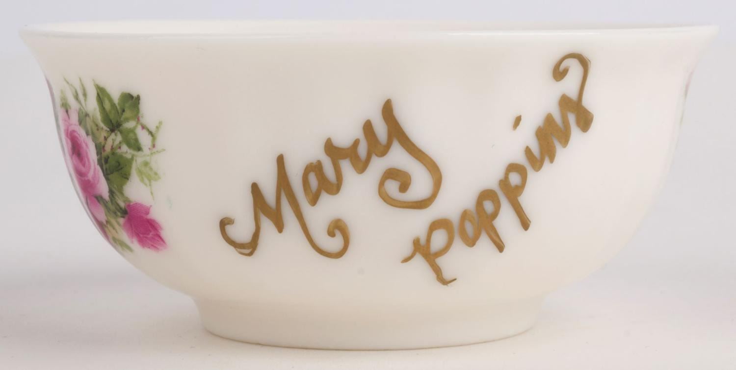 (Allyn Nelson, 1990s-2000s) A decorative colander and bowl inspired by the 1964 live-action and animated film,"Mary Poppins." Featuring a beautiful white miniature colander and bowl with a delicate floral pattern with text on the side which reads,"Mary Poppins." Measuring 3.25" x 1.5" x 3.25" and 3" x 1" x 5.25", the strainer and bowl are in fine condition.