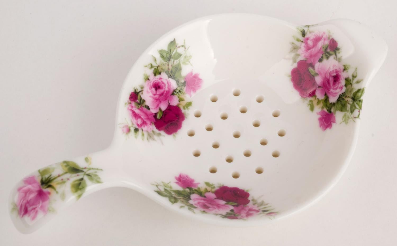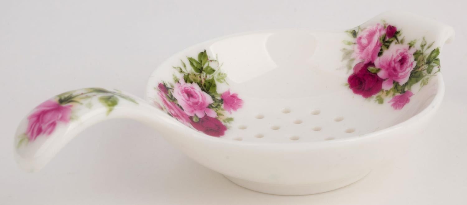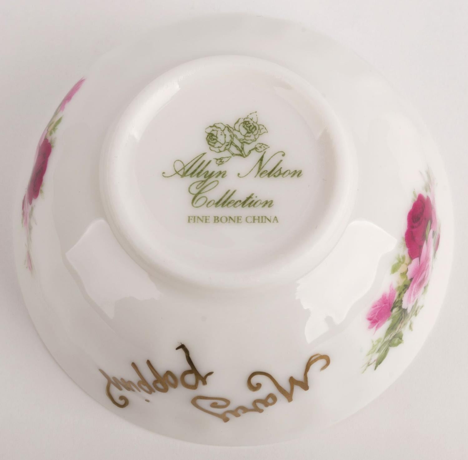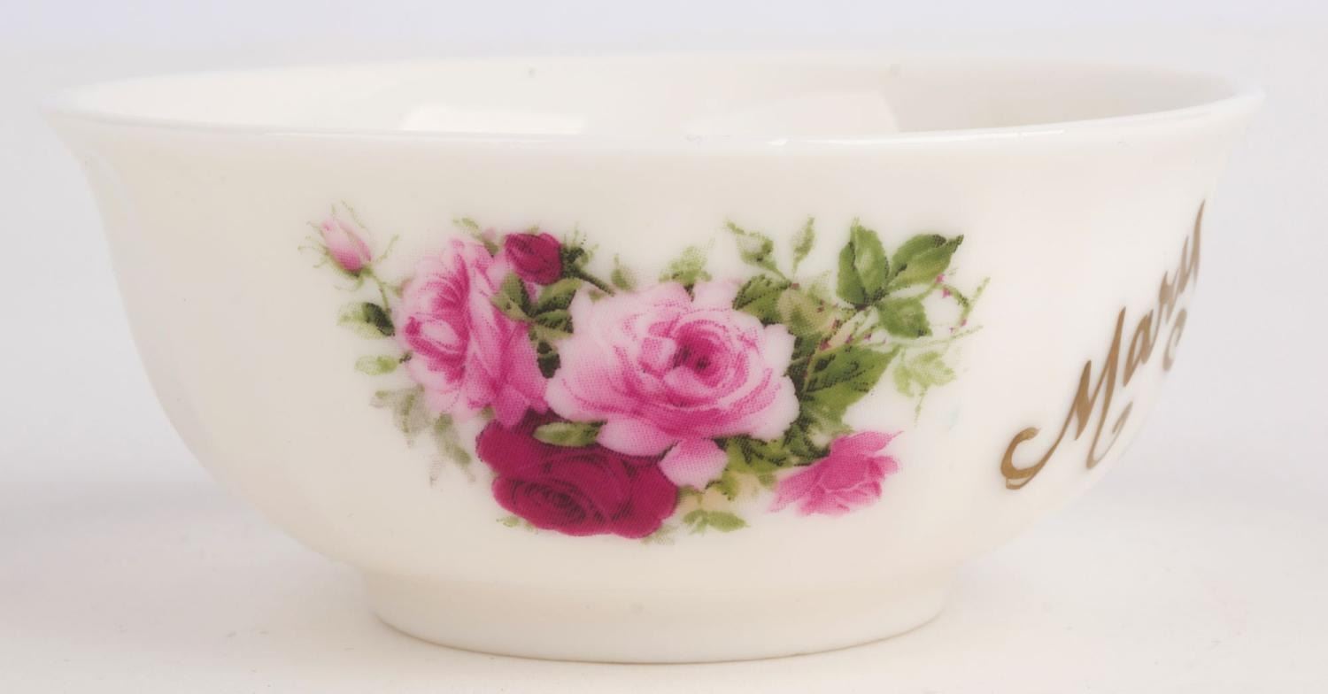 (Allyn Nelson, 1990s-2000s) A decorative colander and bowl inspired by the 1964 live-action and animated film,"Mary Poppins." Featuring a beautiful white miniature colander and bowl with a delicate floral pattern with text on the side which reads,"Mary Poppins." Measuring 3.25" x 1.5" x 3.25" and 3" x 1" x 5.25", the strainer and bowl are in fine condition.