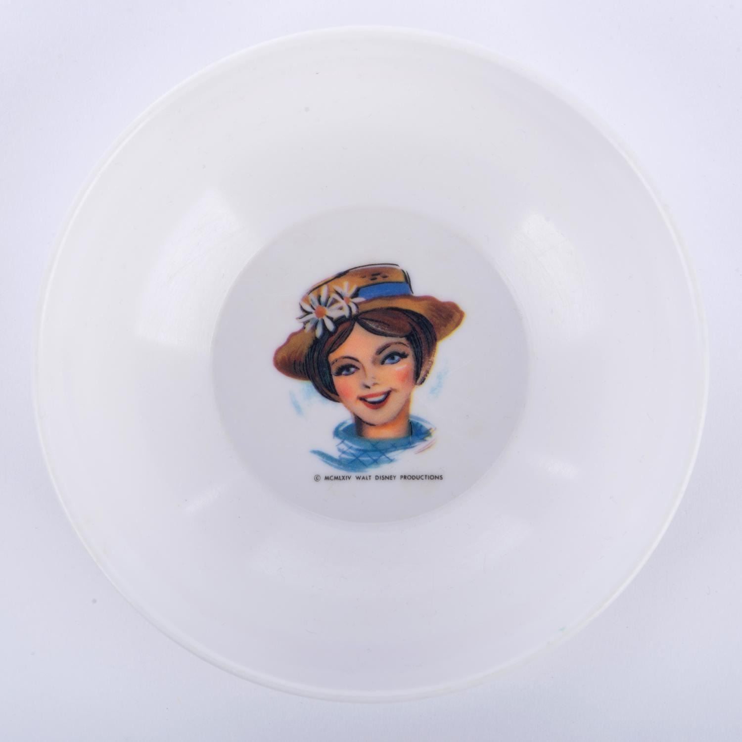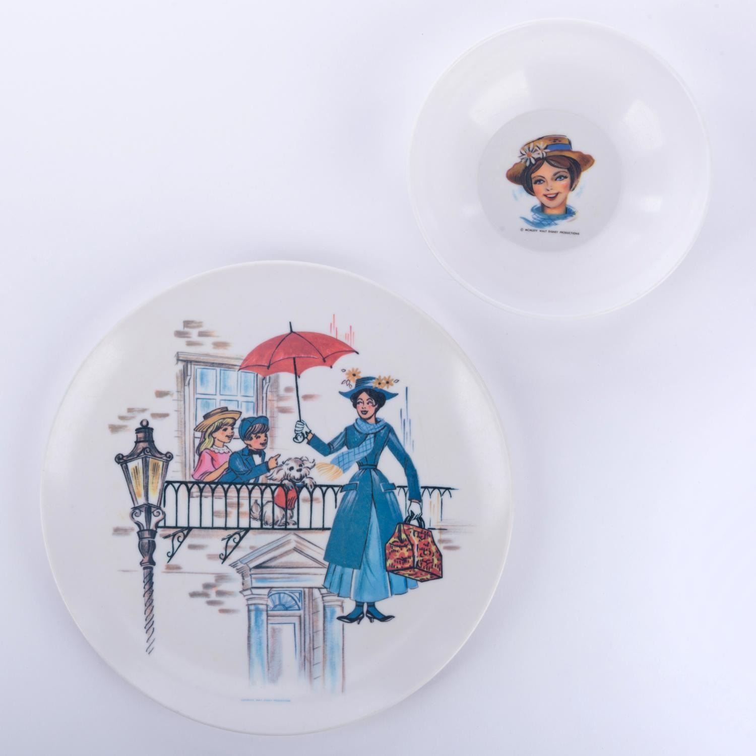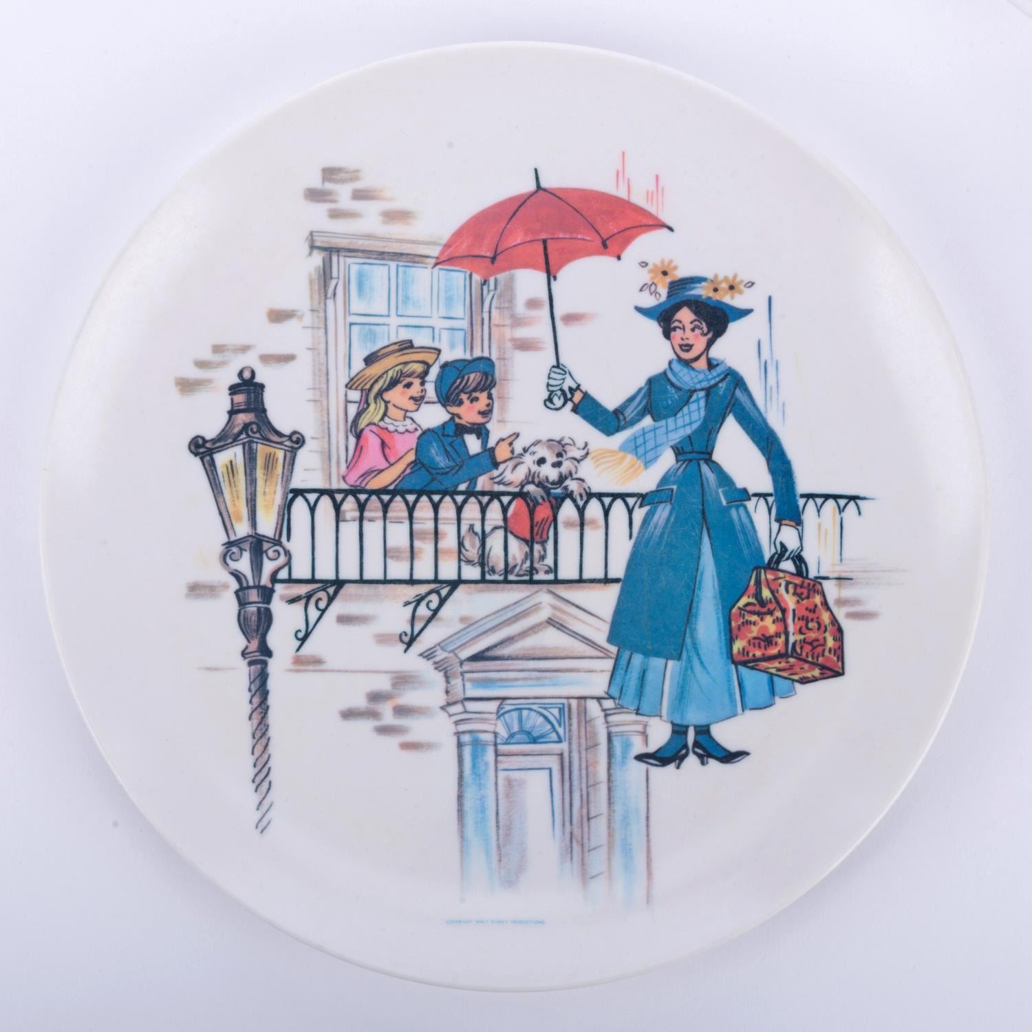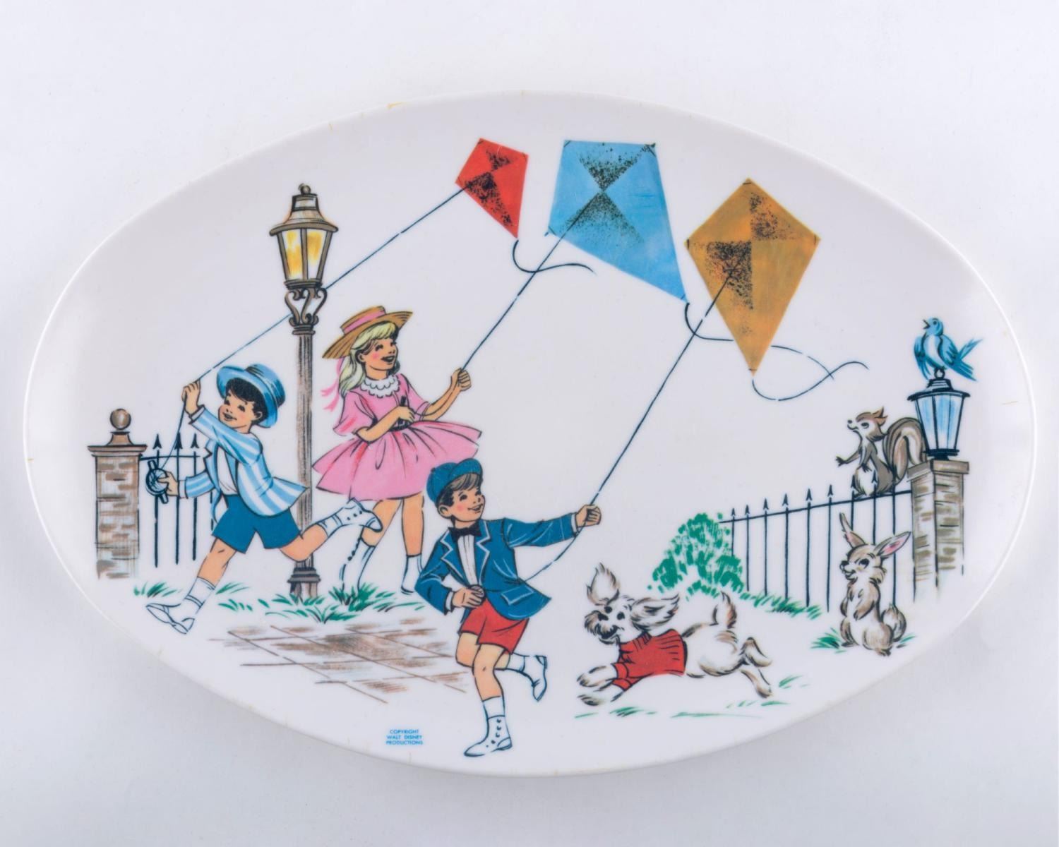 (Stetson, 1964) A"Mary Poppins" plate, bowl, and tray. The bowl measures 2" deep x 5.75" in diameter, the plate is 9" in diameter, and the tray measures 8.25" x 12". All pieces are in very good condition with minor handling wear.