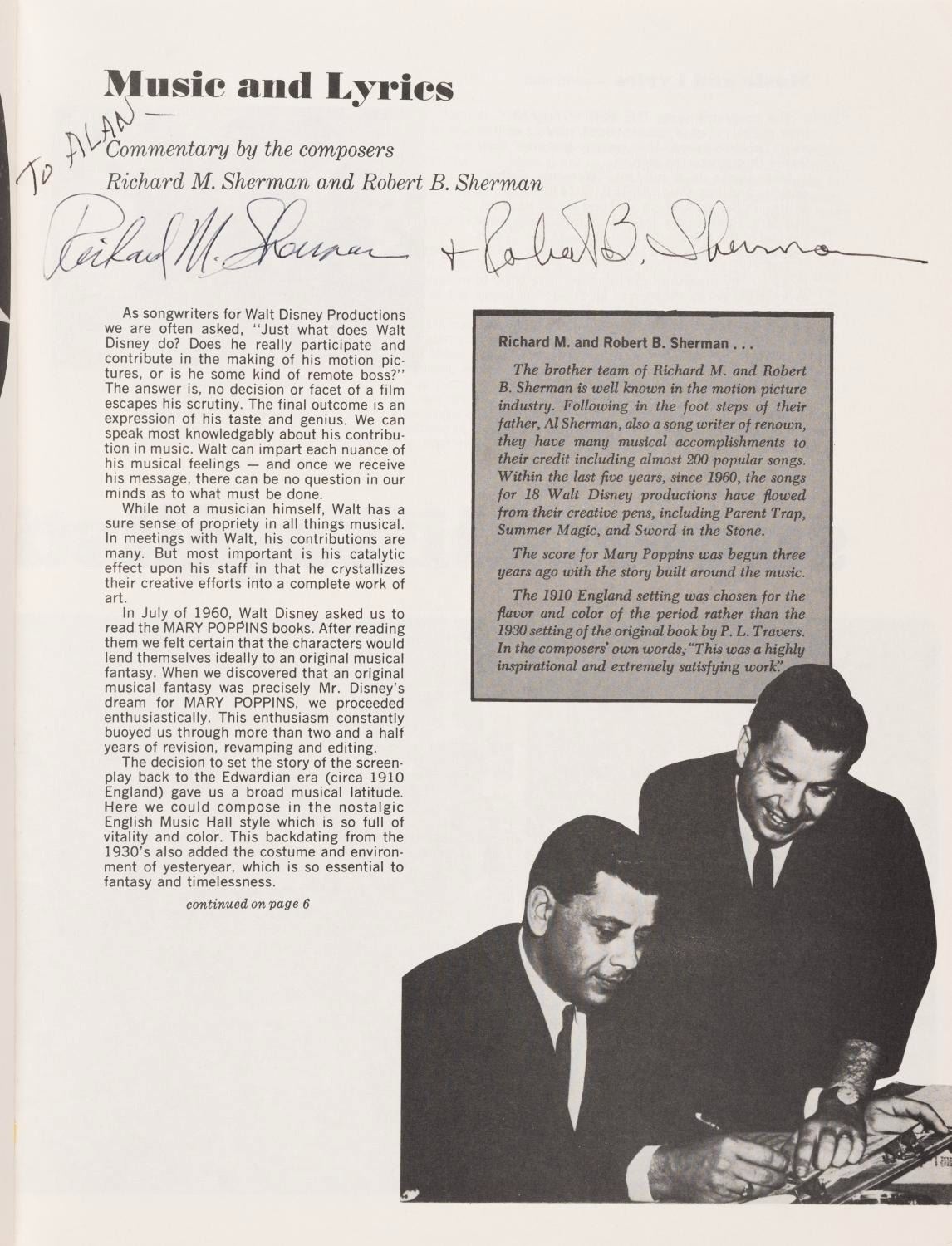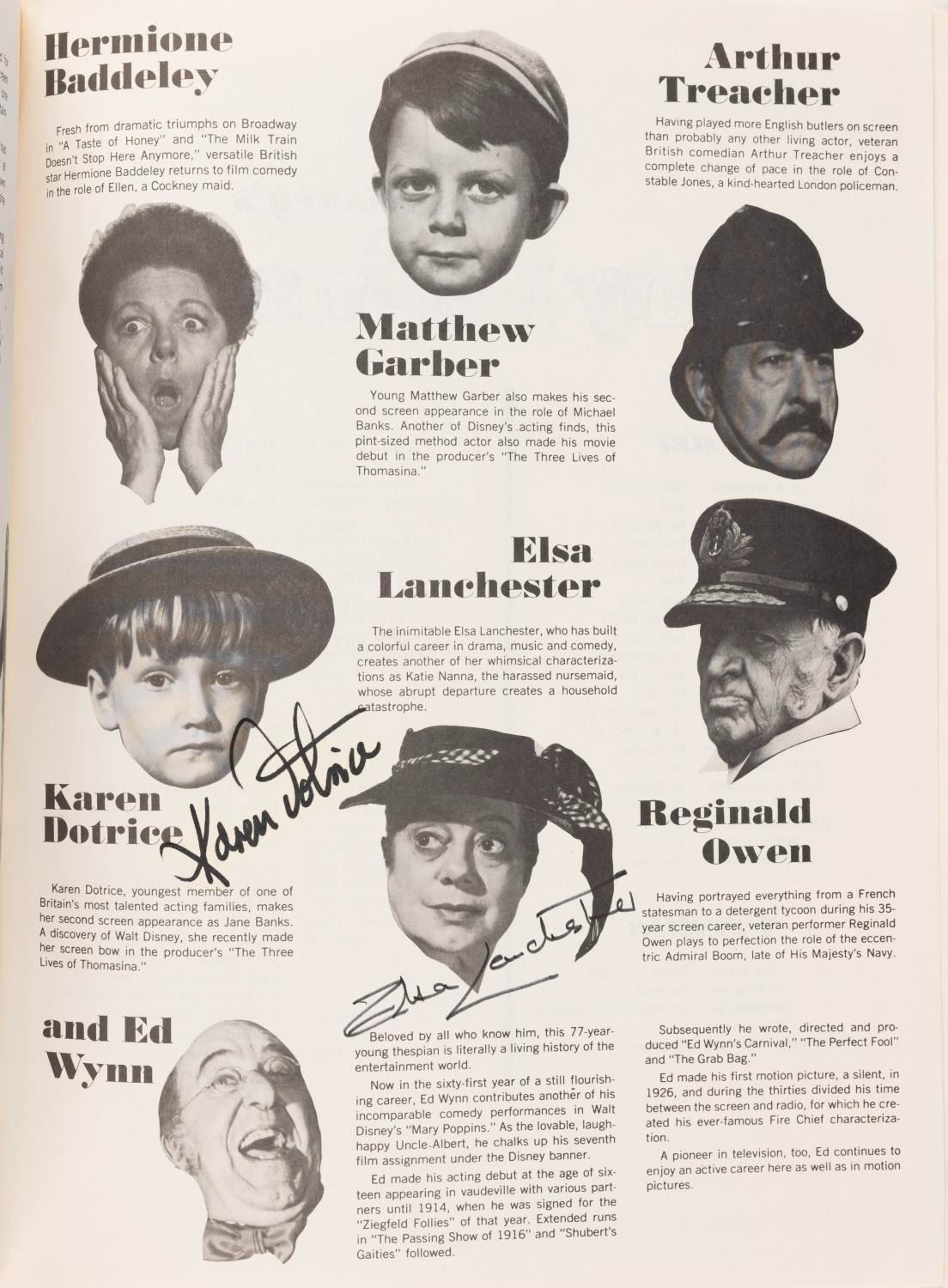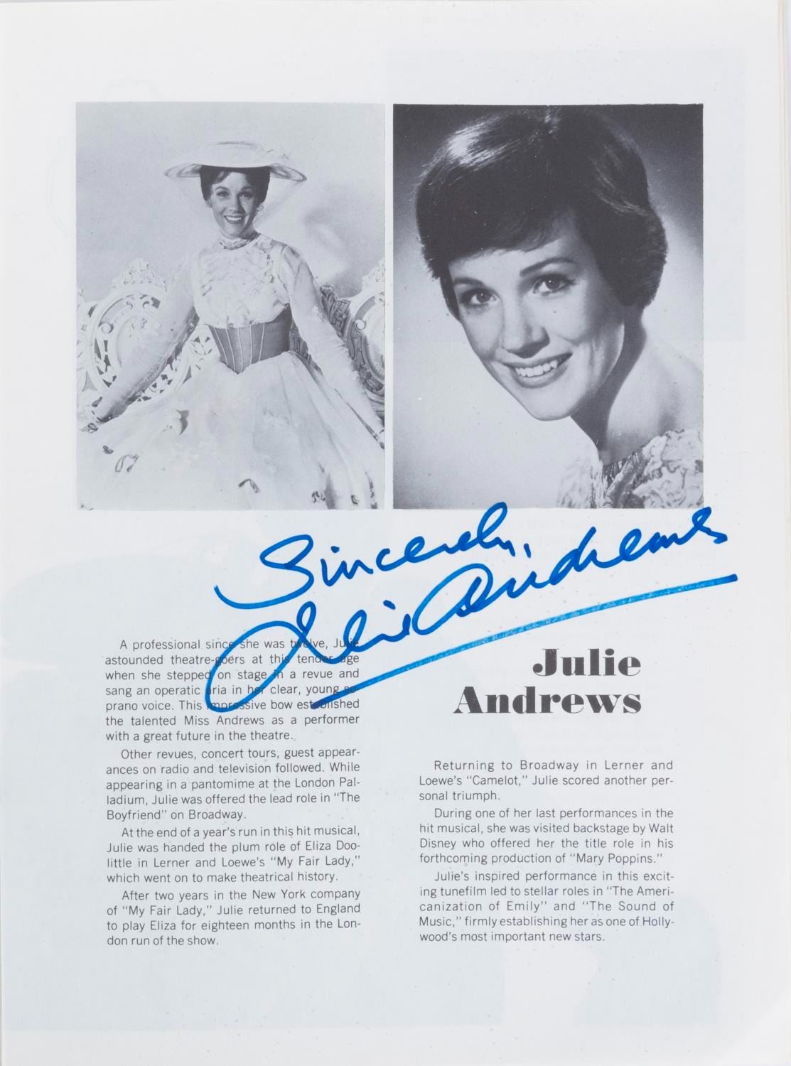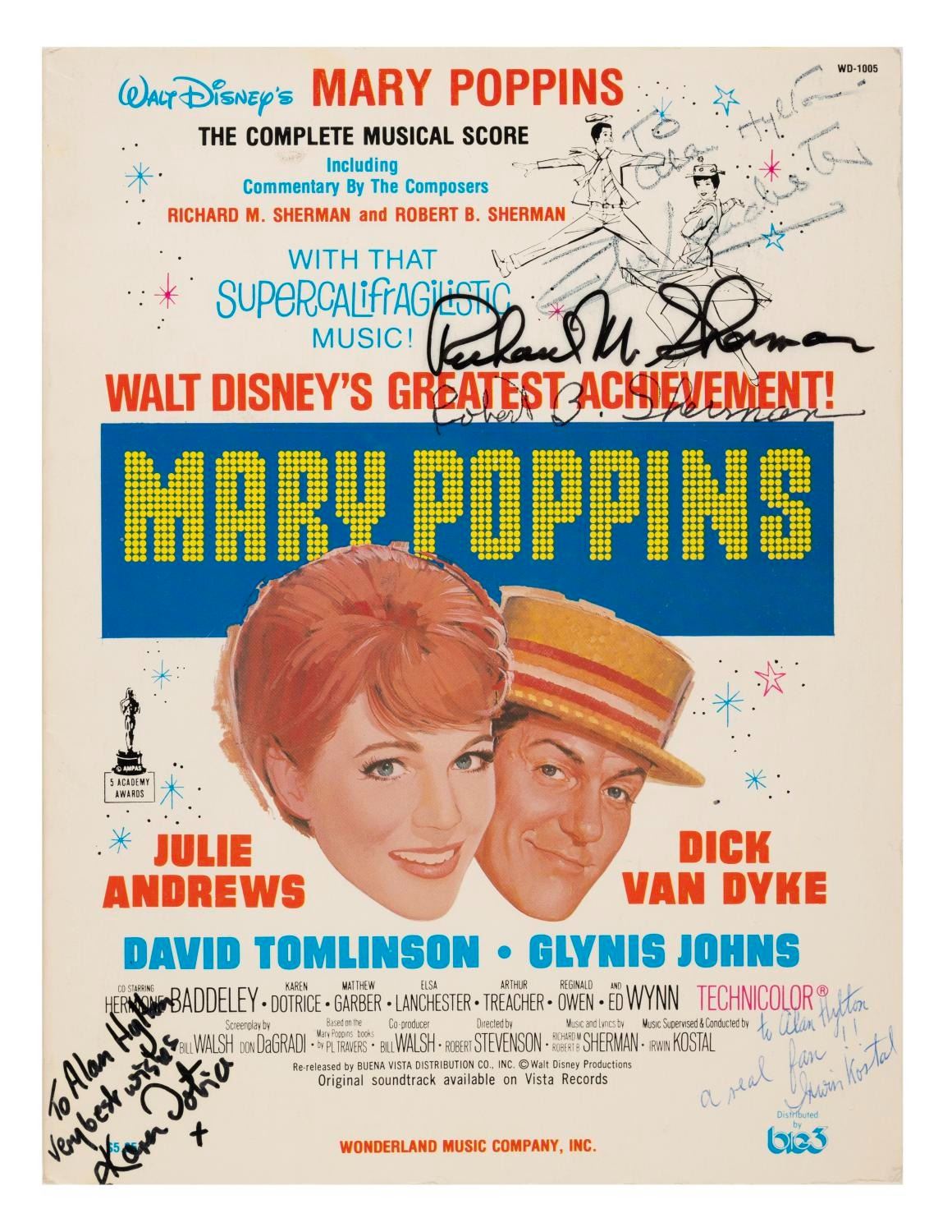 (Wonderland Music, 1979) A “Mary Poppins” complete musical score book signed by six members of the film's cast and crew including Julie Andrews, Karen Dotrice, composers Richard and Robert Sherman, music supervisor Irwin Kostal, and Elsa Lanchester. Each signed by their pictures or credits inside the book, and all but Andrews also signed the cover. The book measures 9" x 12” and is in fair to good condition with some edge-wear from use and some fading to Lanchester's signature on the cover.