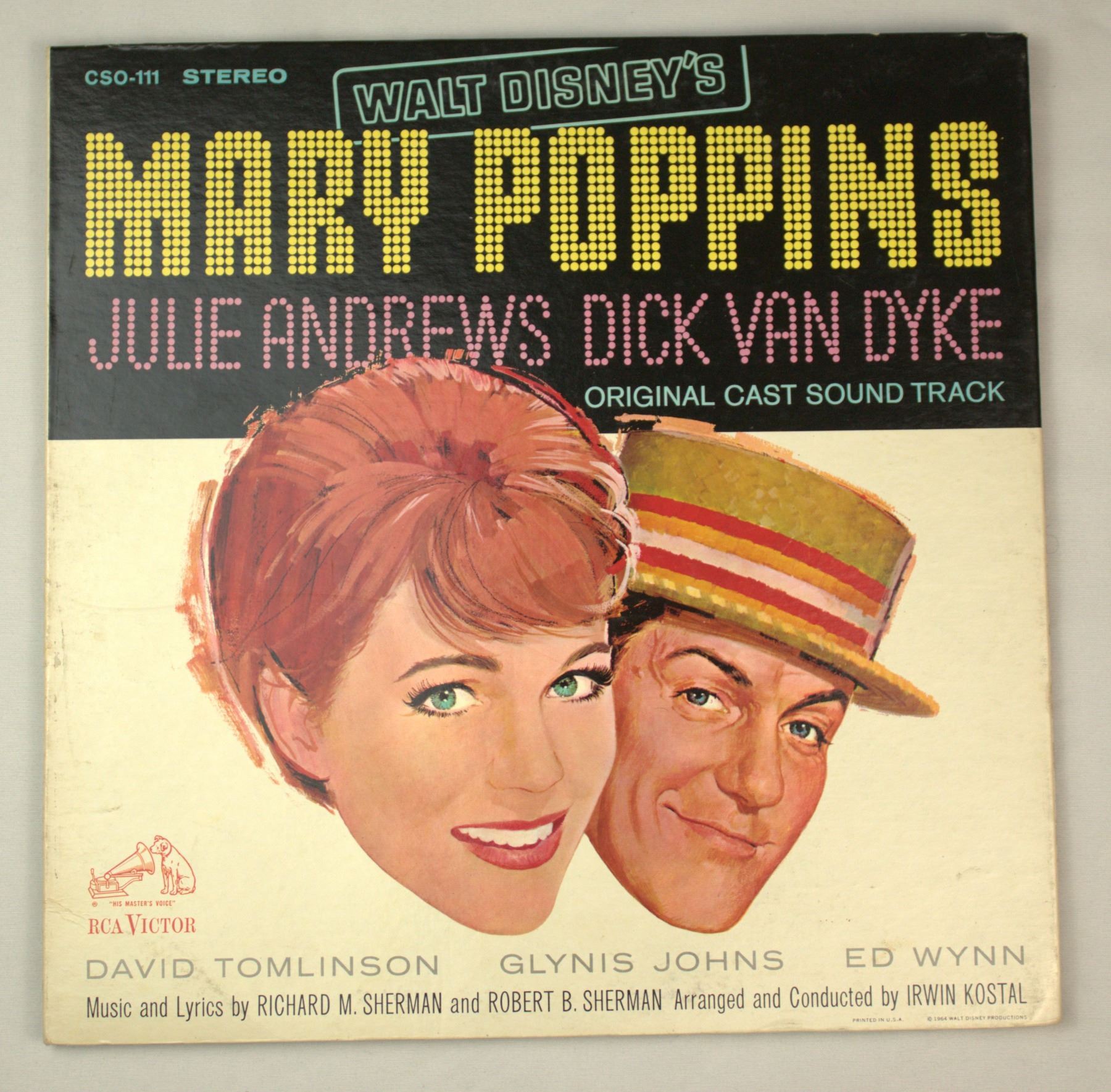 (Disney, 1964) A "Walt Disney's Mary Poppins Original Cast Soundtrack" LP record. Measuring 12" within its 12.5"x12.5" album cover, the used record is in very good condition with light scratches, the dust sleeve is in very good condition, and minor discoloration or wear to its cover.