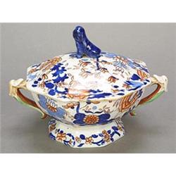 A Mason's Ironstone octagonal two-handled sauce tureen and cover with dog of Fo finial, printed in blue and painted in iron-red with a 'Japan' pattern of urns issuing flowers, 22cm diameter, printed blue mark, circa 1825 See Illustration £300-400