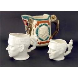 A Mason’s royal commemorative jug, 1935, designed by Cyril Shingler, a limited edition (7.5in.- cracked) and two portrait character jugs, George VI and Edward VIII, 5.25in. and 4.25in. £100-130