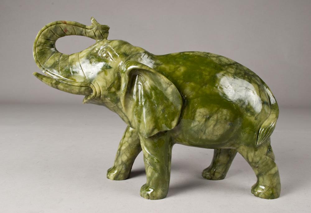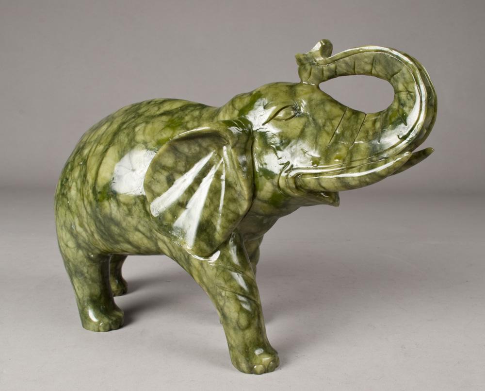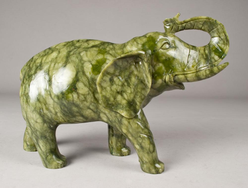 Finley carved with tusks, and trunk raised, the stone a light emeralds with magnificent deep green veining throughout. 11.5"L x 8.5"H, purchased in California in the 1990's for 5,000.00, small chip to side of ear, chip to top of trunk.