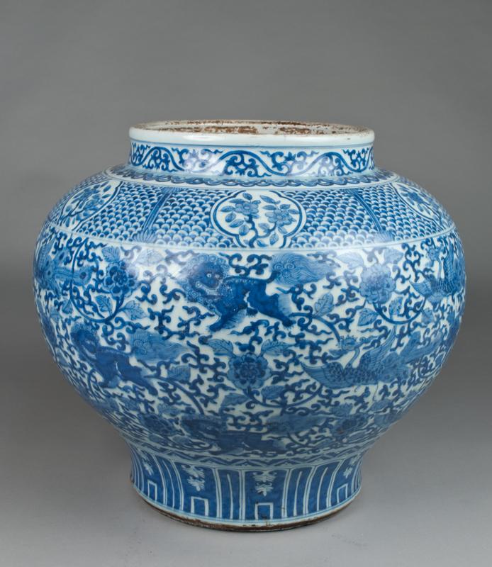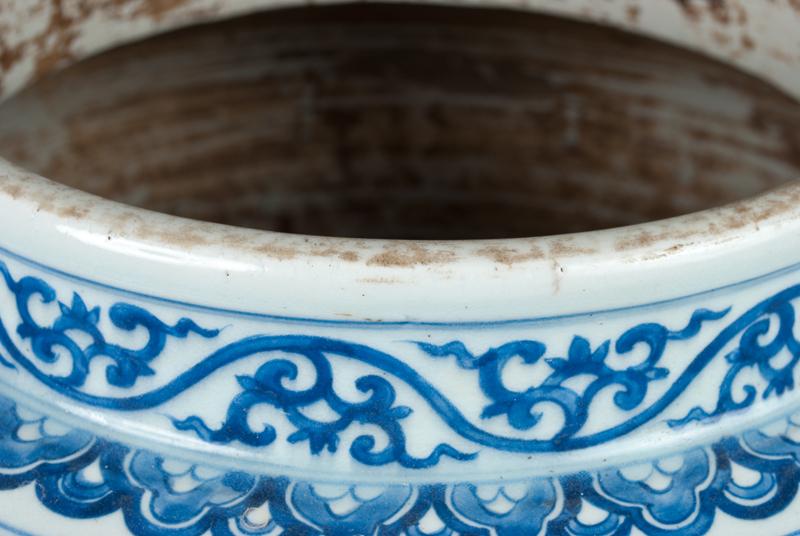 Finely painted to depict Phoenix, foo lions amongst flowering lotus and tendrils, with additional decoration of bouquets of flowers amongst ruyi, signed with six character mark along the rim, the foot blackened from age, hand thrown and extremely heavy, measuring 20.25" D x 18" H, circa 19th century or possibly much earlier. Purchased in Japan after WWII by the consignors Grandfather.