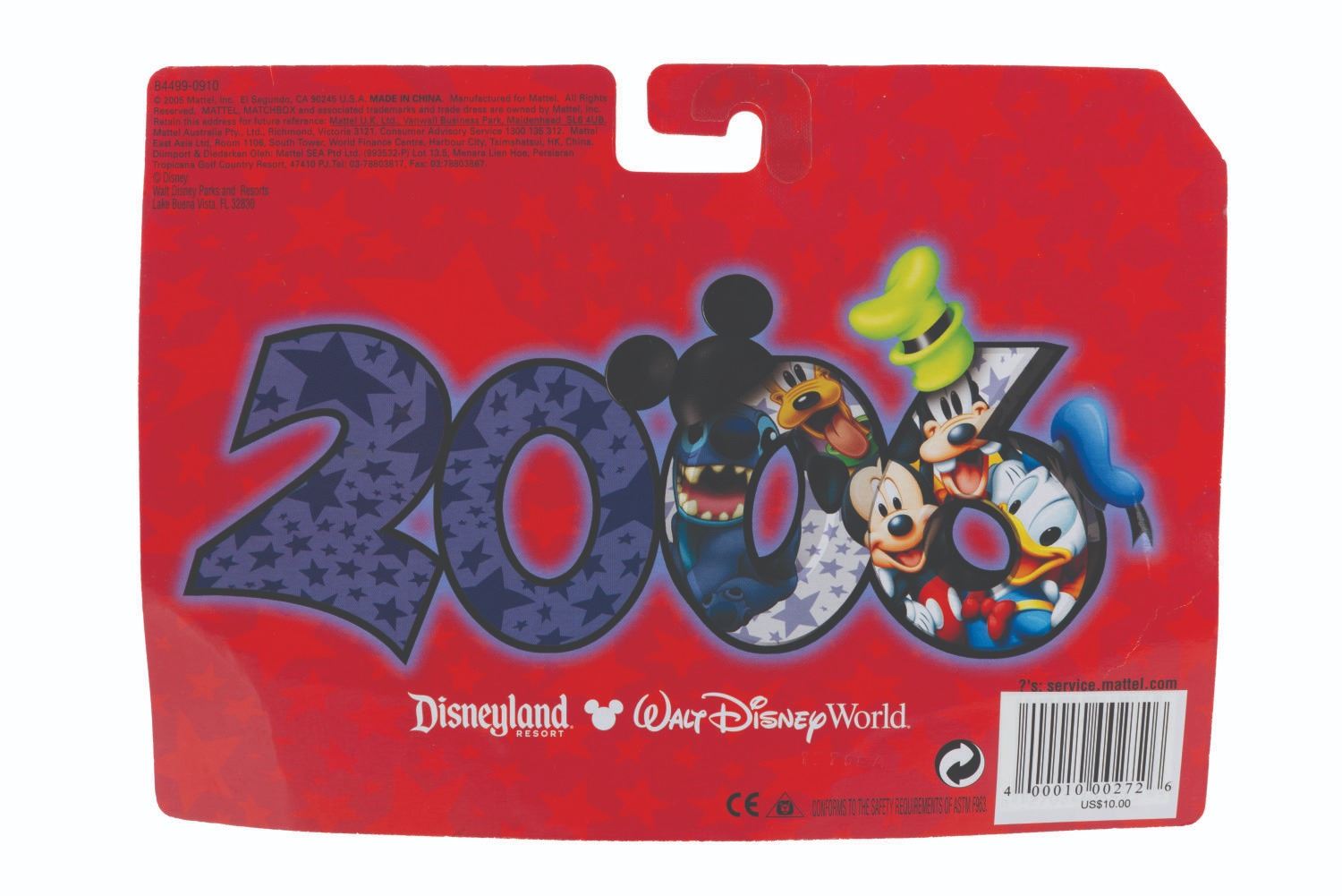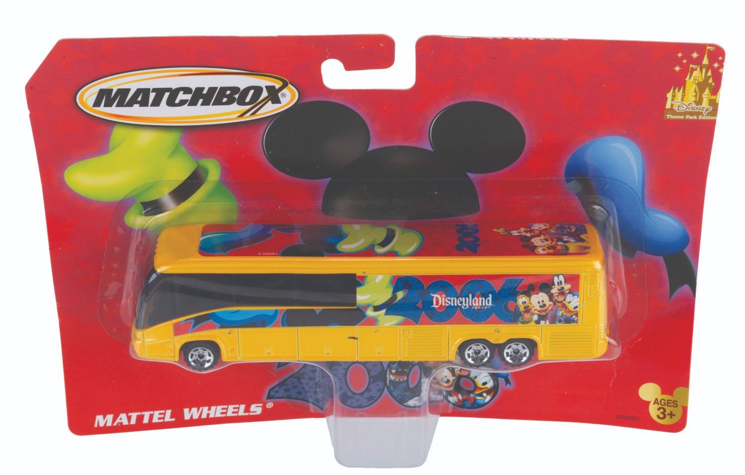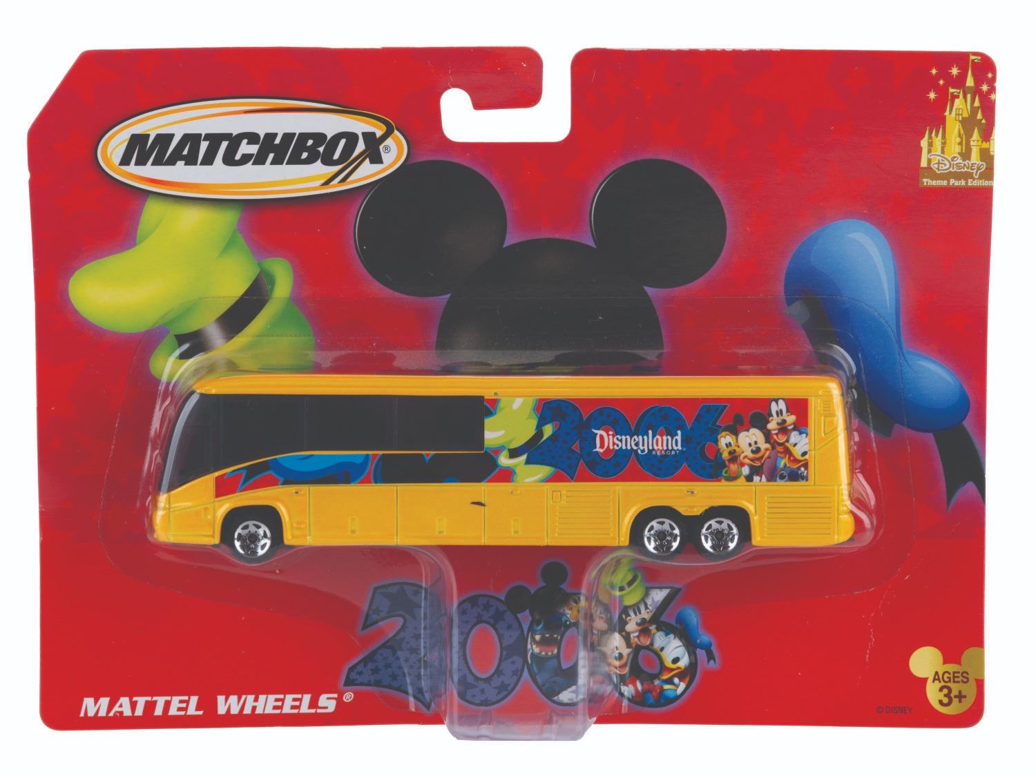 (Mattel, 2006) A yellow Matchbox bus featuring a Disneyland Resort 2006 skin. Measuring 6.5” long and 1.75” tall in its original 6.5” x 9” packaging, the toy is in fine condition, while the packaging exhibits heavy creases.