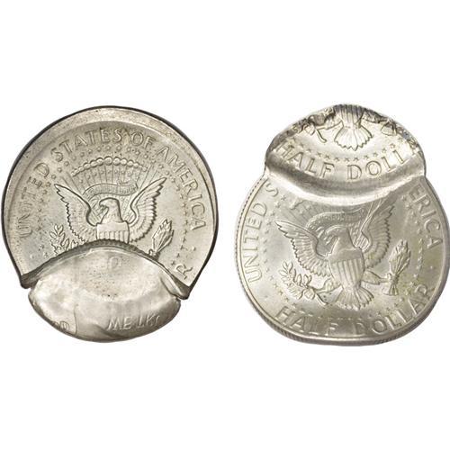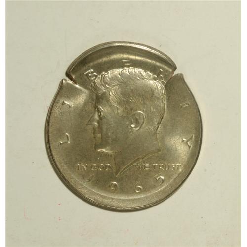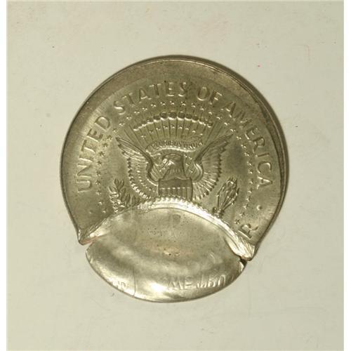 <B>A Mated Pair of 1965 Kennedy Half Dollars.</B></I> The lot includes: <B>1965--Double Struck, Second Strike Off Center with Partial Obverse Indent--MS61 Uncertified,</B></I> and a <B>1965--Broadstruck, Partial Reverse Brockage--MS62 Uncertified.</B></I> The first piece received a normal initial strike, but failed to properly eject from the dies. It was struck a second time, approximately 70% off center toward 6:30. The second strike is at 6 o'clock relative to the first strike, and is uniface reverse since the obverse die was blocked by a newly fed planchet, which became the second coin in this lot. This second piece is broadstruck and shows a 30% brockage from the lower obverse of the first coin. The second strike bent the first coin, and caused two planchet cracks on the second coin.<BR><BR><b>Shipping:</b> Coins & Currency (<a target="_blank" href="http://www.heritageauctions.com/common/shipping.php">view shipping information</a>)
