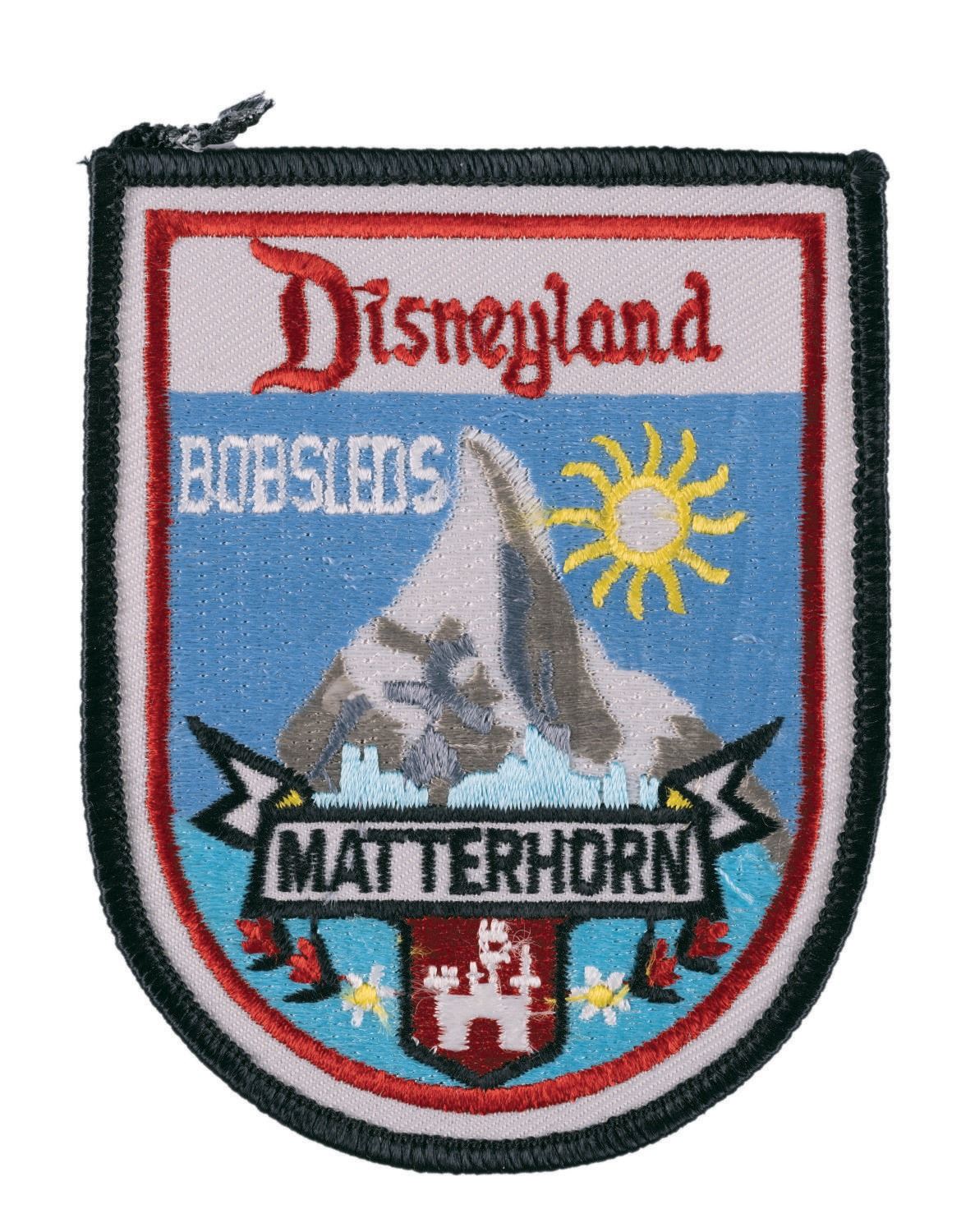 (Disneyland, 1980s) A costume patch prepared for the Matterhorn Bobsleds costumes worn by Attractions Hosts and Hostess at Disneyland. Through the decades, the crest design was occasionally updated, and this edition features a small castle emblem flanked by flowers. Measuring 3"x4", the patch is in very good condition with minor wear from handling and age.