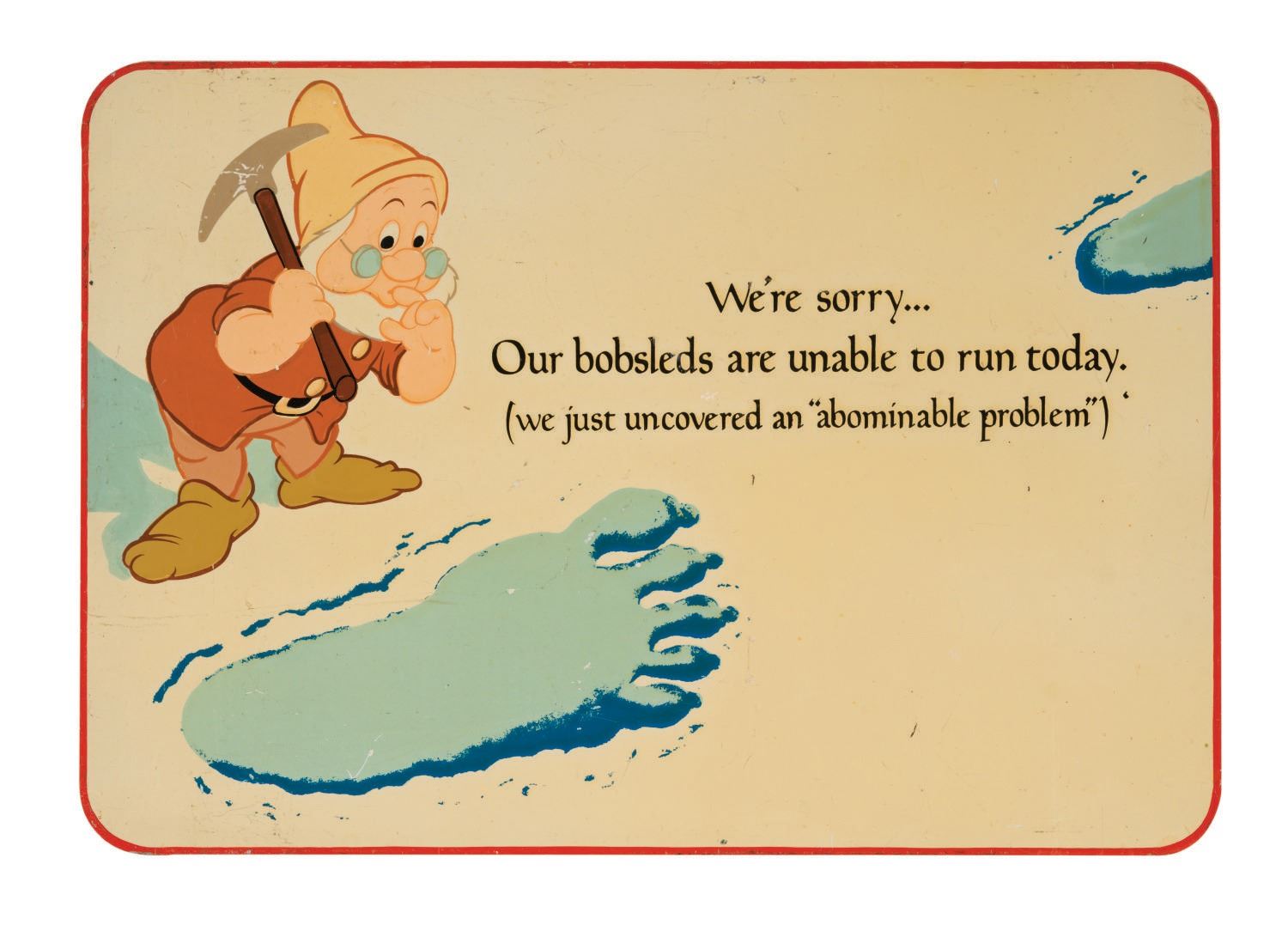 (Disneyland, 1980s) A Matterhorn Bobsleds Closed Sign. This sign was created sometime after the addition of the Abominable Snowman in 1978 and features Doc encountering a large footprint of the creature. The sign was prepared and crafted to alert Guests to the periodic closure of the attraction due to "an ‘abominable problem.'" The sign retains original welded mounting hardware on its reverse. Measuring 17.25"x12"and 1" wide, the metal sign is in good condition with scuffs, scratches, and wear from display, exposure, and age.
