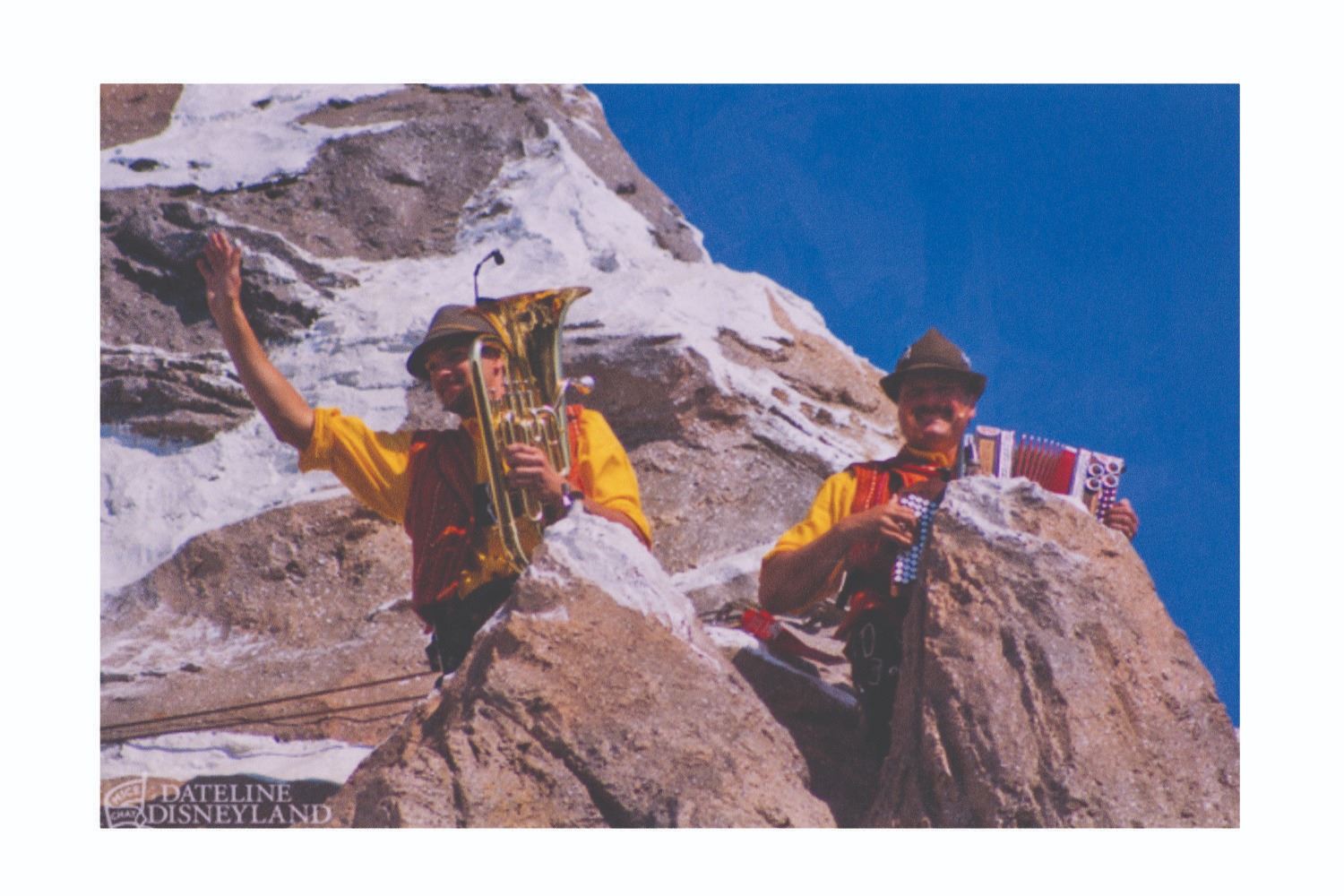 (Disneyland, 2000s) A photo of alpine musicians performing on the Matterhorn, watermarked with a logo for the Mice Chat Dateline Disneyland online forum. Measuring 4" x 6", the photo is in fine condition.