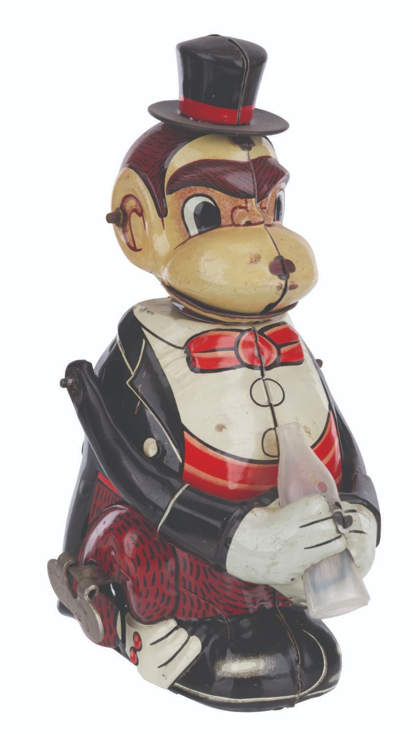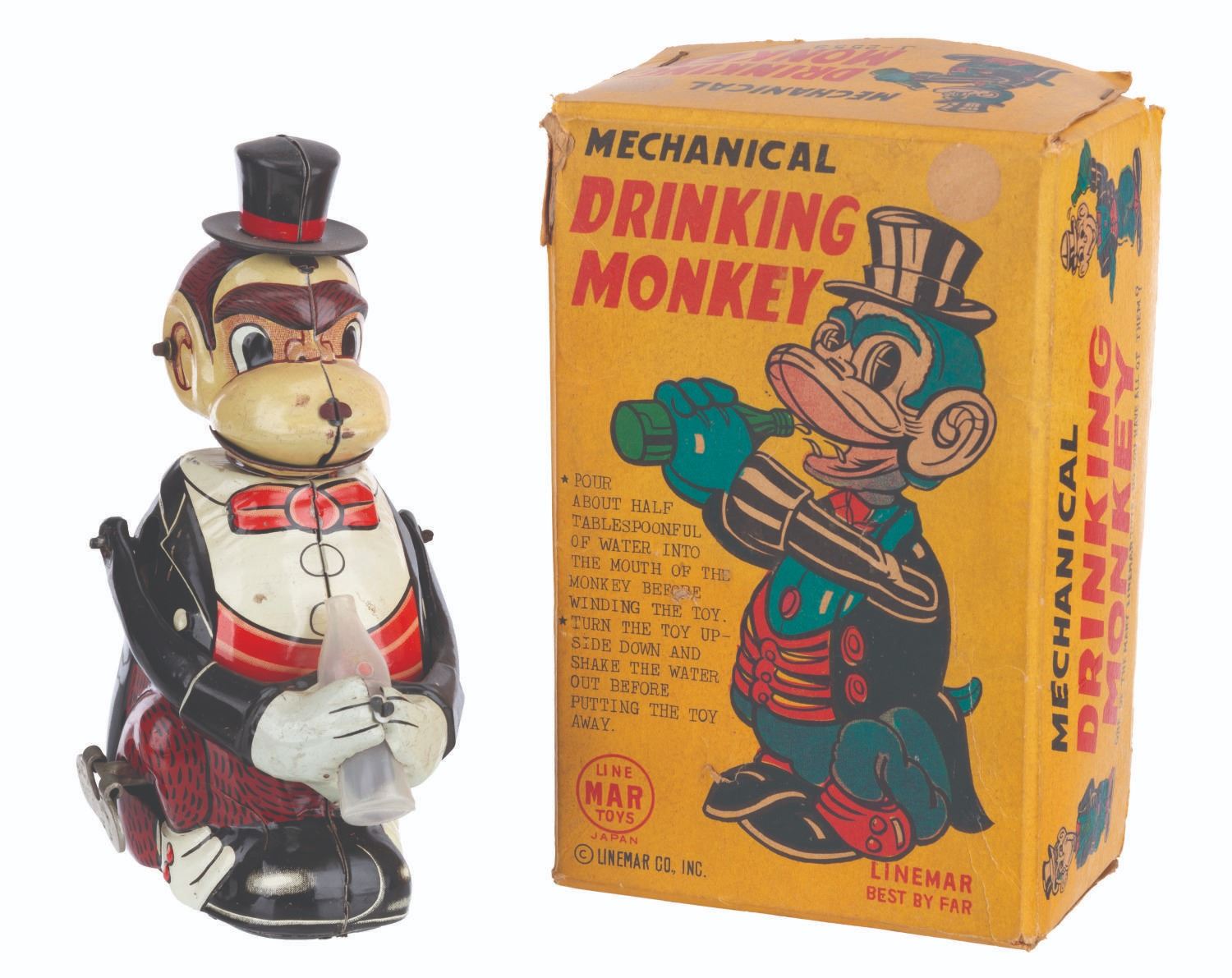(Linemar, 1950s-1960s) A mechanical drinking monkey wind-up toy manufactured by Linemar. Marx created the Linemar brand in Japan as a way to cut down on production costs in the 1950s. When wound, the monkey raises the plastic bottle to its lips. The toy has been tested and is in working condition. Measuring 3.5” x 6.5” with its original 2.75” x 6.5” x 4.25" deep box, the tin litho monkey is in very good condition with light scratches, stains, and wear from use.