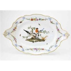 A Meissen (Marcolini) shaped oval two-handled tureen stand painted with a jay, a bullfinch and a blue tit within landscape vignettes, the foliage moulded handles enriched in gilding, 24ins. wide, repair to one handle, blue crossed swords and star mark, circa 1780 . Provenance Christies 28th November 1977 - Lot 125 £1,200-1,600