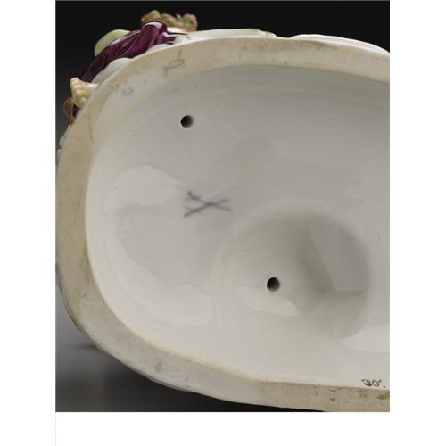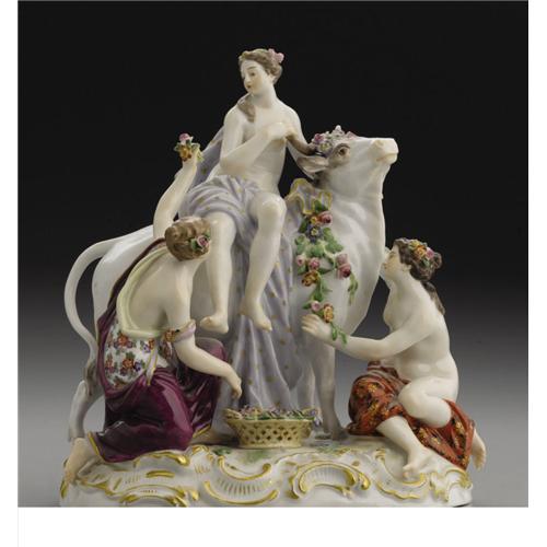 <B>A German Porcelain Figural Group: <I>Europa and the Bull</B></I></B></I><BR><BR>Meissen Porcelain Manufactory, Meissen, Germany<BR>Late Nineteenth Century<BR>Porcelain with polychrome enamel and gilt decoration<BR>Marks: (crossed swords), <I>30</B></I> in gilt, incised <I>2697, 26</B></I><BR>8.5 in. high<BR><BR>After a model by F.E. Meyer, the figure of Europa seated on the back of a white bull and two attendants dressing the bull with floral garlands, on oval rococo pattern base. <BR>
