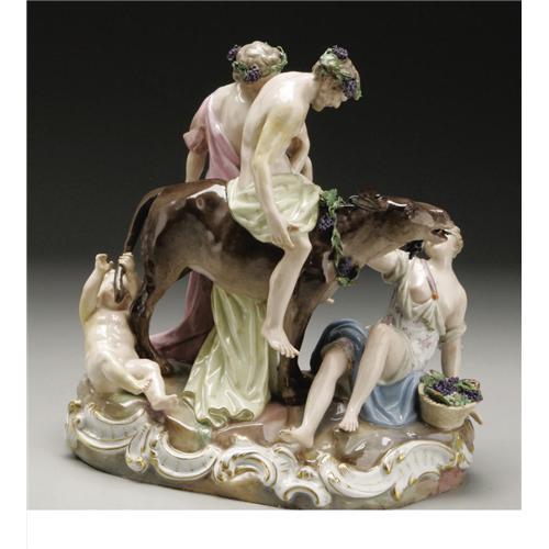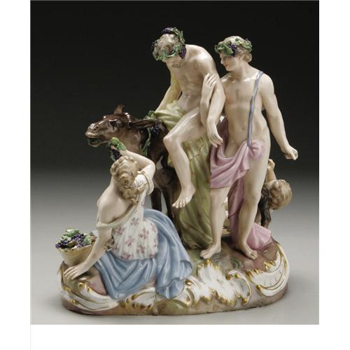<B>A German Porcelain Figural Group</B></I><BR><BR>Meissen, Germany<BR>Late Nineteenth/Early Twentieth Century<BR>Porcelain, enamel and gilt<BR>Marks: crossed swords in underglaze blue, numbered <I>29,</B></I> incised <I>2724,</B></I> impressed <I>141</B></I><BR>8.5 in. high<BR><BR>The figural group of Drunken Silenus, depicting a faun supporting the drunken Silenus as he rides an ass, while a Bacchante with her basket of grapes, and a cherub, continue to frolic at his feet, all on a shaped base edged with gilt rocaille<BR><BR>Provenance: Walsh Family Art Trust1 <BR><BR><B>Condition Report:</B> Normal signs of wear as appropriate with age, repairs to the tail of ass; arms and leg of cherub; arm of sSilenus and foot of nympb, loss to faun's trailing grape vine