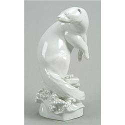 A Meissen Weiss model of an otter modelled by M. Esser, crouched on a rocky base, 25cm high, the reverse impressed M. ESSER and with blue crossed swords mark, the underside with incised and impressed marks, 20th century