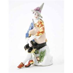 A Meissen figure of Harlequin playing the bagpipes modelled by J.J. Kaendler in conical hat with...