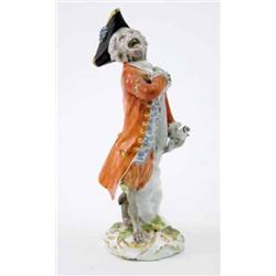 A Meissen figure of a soloist from the monkey band, modelled by J.J. Kaendler holding a sheet of music, singing, wearing orange coat, blue waistcoat and black tricorn hat, standing on circular flower encrusted tree stump base, 6ins. high, repaired, blue crossed swords mark at back, circa 1760. Provenance Christies 9th May 1977 - Lot 169 £300-400