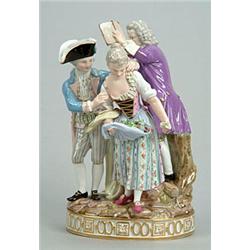 A Meissen group, modelled with a young gentleman escorting a maid gathering apples in her apron, behind them, a third figure, probably the boy's tutor, gesticulates holding an open book, the boy's books and his cane in a pile at their feet, painted with coloured enamels and gilt, on an oval base with a gilt ovolo band frieze, 21cm high, blue crossed swords mark, Pressnummern, and incised J. 61, late 19th century (minor chips)