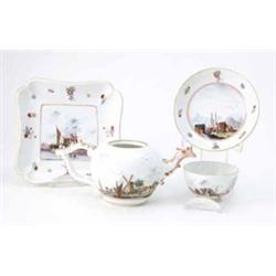 A Meissen teabowl and saucer painted by B.G. Hauer with skating and harbour scenes, a teapot (lacking lid) and a shaped square teapot stand teapot 7.75ins., teabowl cracked, the stand riveted, blue crossed swords and gilt D marks. Provenance Christies 4th July 1977 - Lot 209 £300-400