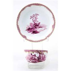 A Meissen teacup and saucer painted en camaieu rose with a hound guarding dead game and two deer in a wooded landscape vignette, within a puce chequer-pattern border edged with gilt C scrolls, crossed swords and dot mark, circa 1765. Provenance Christies Charleston Manor 15th October 1980 - Lot 1482 £300-400