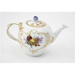 A Meissen teapot and cover moulded with trellis and swags of flowers and painted with fruit and flowers within gilt trellis and rococo scroll cartouches with entwined handle and blue flower finial 6.75ins. wide, 2 small chips, blue crossed swords and dot marks, circa 1770. Provenance Christies 17th October 1977 Lot 183 £300-500