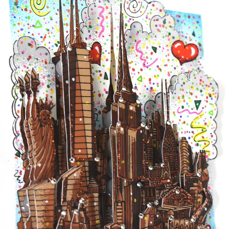 "A Melting Pot of Chocolate...NYC" is a 3D limited edition silk screen construct on paper by Charles Fazzino, DX numbered 71/100 and hand signed by the artist. This piece comes custom framed. Includes Certificate of Authenticity. Measures approximately 12.5" x 18.5" (framed), 5" x 10" (image).