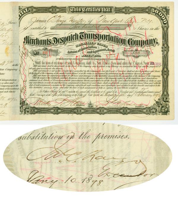 JAMES C. FARGO. 1890, New York. A certificate for 143 shares of the Merchants Despatch ransportation Company signed "Jas. C. Fargo" once on the front as president and once on the back. The shares were issued to "Jas. C. Fargo Executor". Black on white paper with a fancy, engraved border. Pen cancelled in pink ink, including one through the autograph on the front. Receipt glued to the left side and in fine condition.