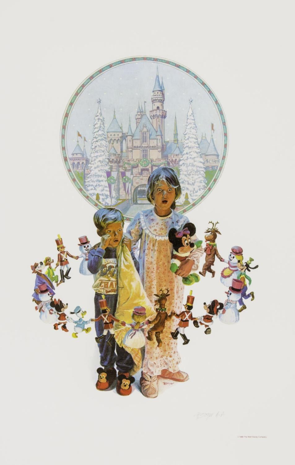 (Disneyland, 1988) A beautiful Artist's Proof for a lithograph by Charles Boyer. Titled"Merry Christmas at Disneyland," the lithograph features two young children on Christmas morning surrounded by Disney characters. This Artist's Proof is hand-signed by Boyer in the lower-right and reads"AP". Measuring 20" x 30", the art is in very good condition with very light edge wear to the bottom left corner.