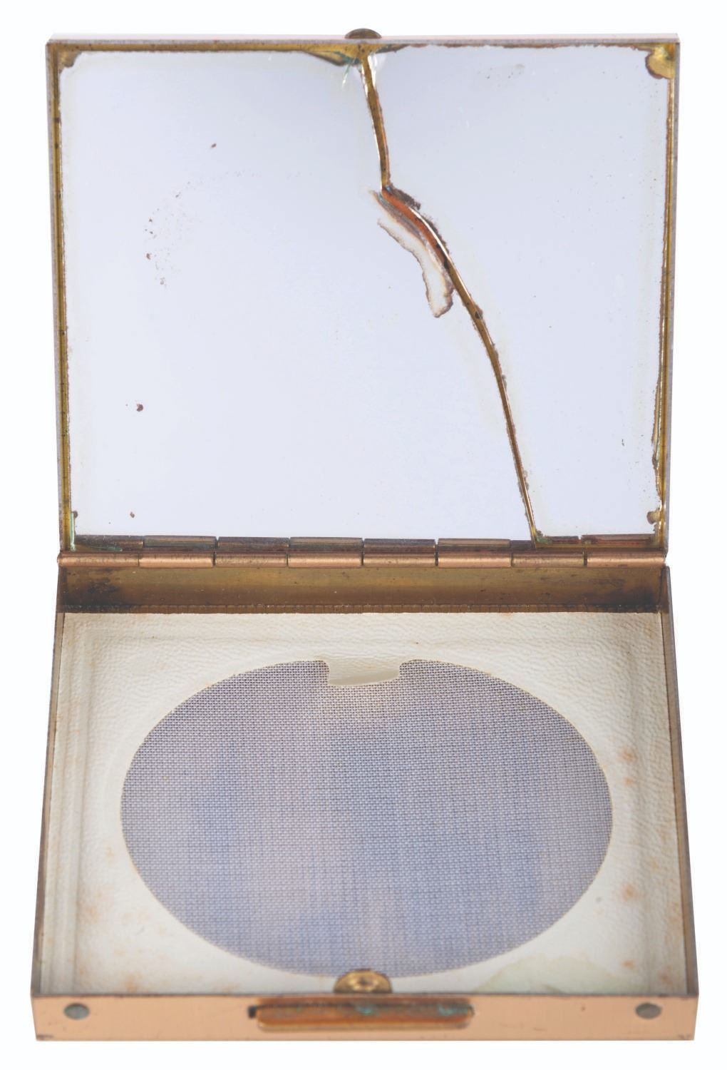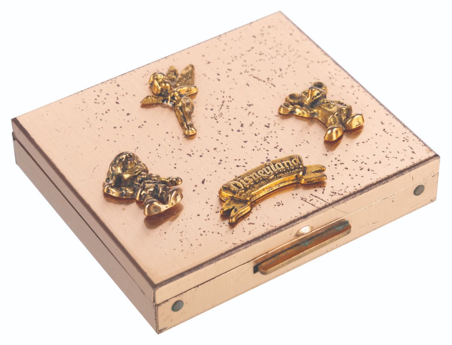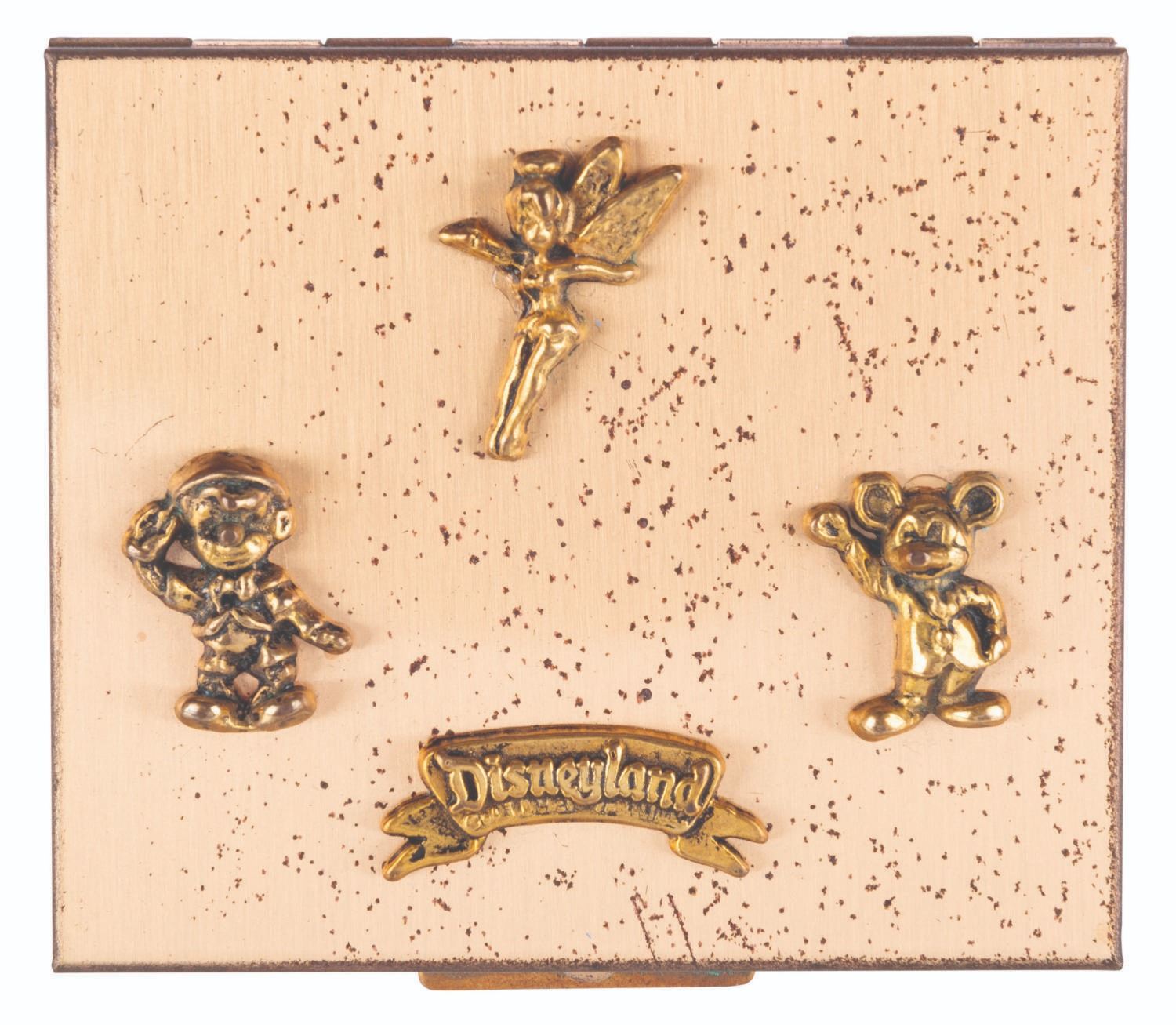 (Disneyland, 1950s-60s) A Disneyland souvenir powder compact featuring metal reliefs of Mickey, Pinocchio, and Tinker Bell. The metal compact has the original powder screen and mirror inside. Measuring 0.5" x 2.5" x 2.75", the compact is in fair to good condition with a broken mirror, discoloration, and pitting on the metal lid.